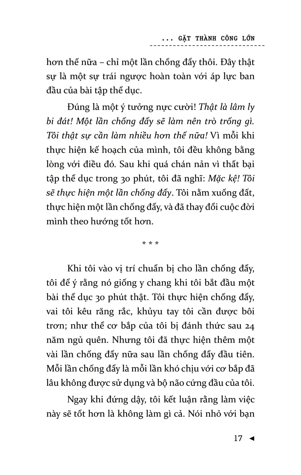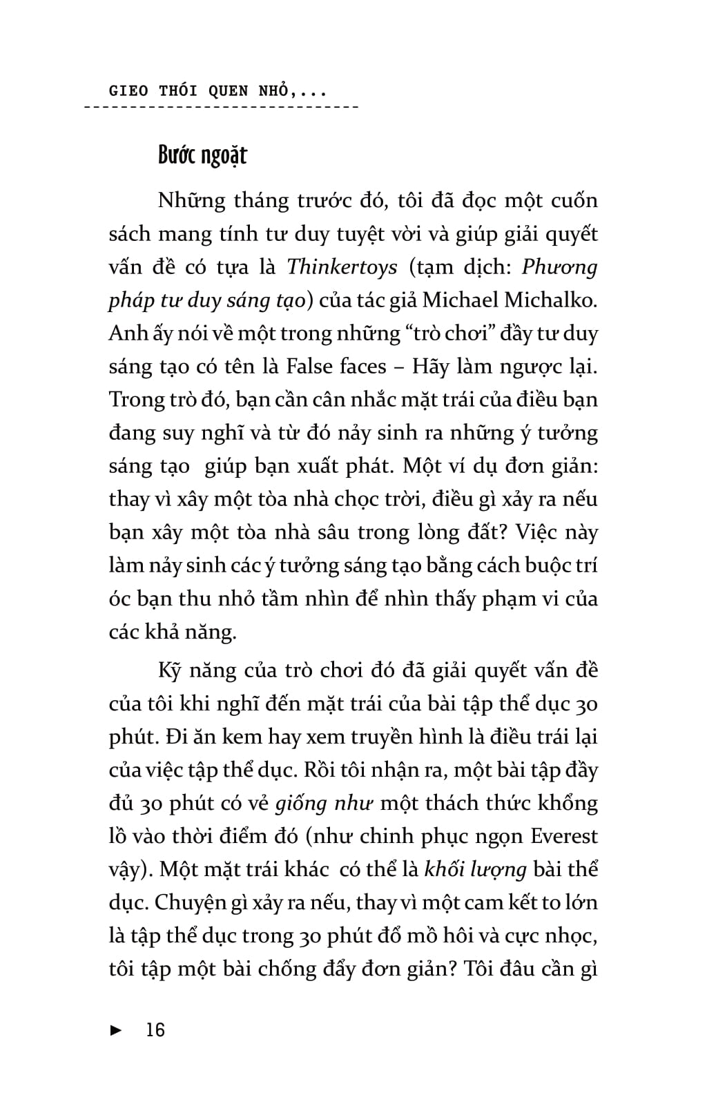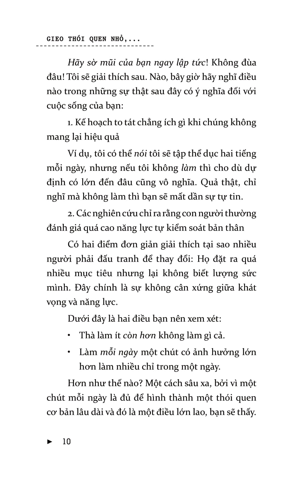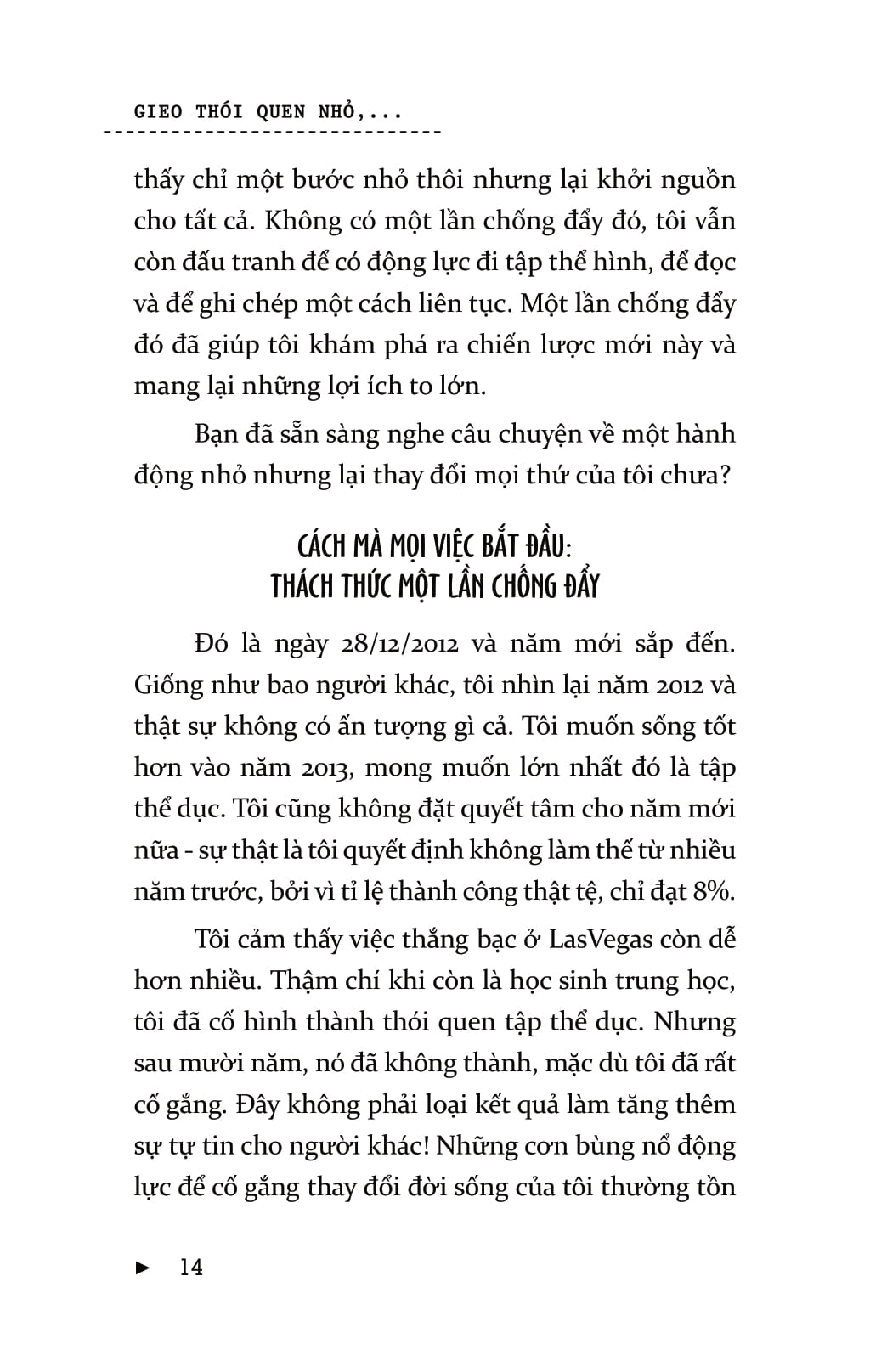 Mọi người thường nghĩ, chính họ là nguyên nhân khiến bản thân không thể đạt được sự thay đổi lâu dài. Nhưng vấn đề ở đây không phải là bản thân họ mà là chiến lược của họ. Bạn có thể đạt được những thành công to lớn mà không chịu bất cứ áp lực nào và sẽ không lặp lại thất bại nhờ những cách thức, phương pháp kiểu như: “lấy động lực”, sự kiên trì, và thậm chí là “làm đại đi”. Để đạt được những thay đổi lâu dài, bạn đừng cưỡng lại bộ não của mình. Khi bạn bắt đầu làm theo những chỉ thị của não bộ – theo dẫn dắt từ Gieo thói quen nhỏ gặt thành công lớn – thì những thay đổi tích cực, lâu dài sẽ không khó để đạt được! Gieo thói quen nhỏ gặt thành công lớn là cuốn sách khoa học tìm ra sự mâu thuẫn trong hầu hết các chiến lược phát triển bản thân và lý giải nguyên nhân tại sao các thói quen nhỏ lại tạo nên sự thống nhất rõ rệt. Một thói quen nhỏ là hành vi tích cực rất nhỏ mà bạn bắt bản thân phải làm mỗi ngày. Nó “quá nhỏ để thất bại” nhưng lại mạnh mẽ không thể lường trước và là một chiến lược góp phần hình thành nên thói quen ưu việt.Cuốn sách gồm có bảy phần chính. Ba phần đầu của cuốn sách bàn về việc xây dựng thói quen, bộ não, ý chí, động lực và chỉ ra cách chúng liên hệ với nhau. Hai phần tiếp theo bàn về các kết luận mang tính lô-gic và cách khai thác một cách khoa học nhất những thông tin cung cấp. Ba phần cuối hướng dẫn bạn áp dụng những cách thức đó trong cuộc sống.Chiến lược này sẽ giúp cuộc sống của bạn trở nên hoàn hảo hơn 99% số người sống trên hành tinh này.