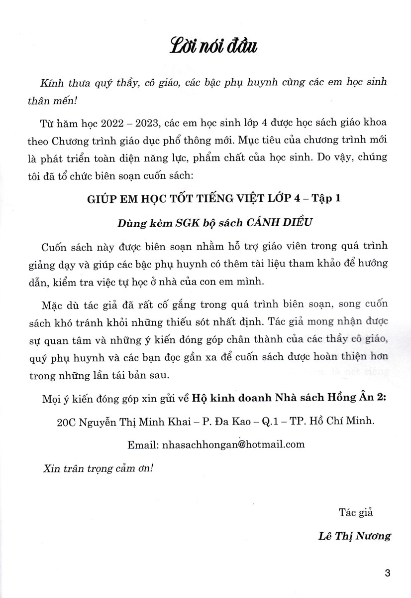 Từ năm học 2022-2023, các em học sinh lớp 4 được học sách giáo khoa theo Chương trình giáo dục phổ thông mới. Mục tiêu của chương trình mới là phát triển năng lực, phẩm chất của học sinh. Do vậy, nhằm hỗ trợ quý thầy cô và các bậc phụ huynh có thêm tài liệu hướng dẫn các em học sinh học tốt môn Tiếng Việt lớp 4, chúng tôi đã tổ chức biên soạn cuốn sách: GIÚP EM HỌC TỐT TIẾNG VIỆT LỚP 4 – TẬP 1 (Dùng Kèm SGK Cánh Diều).
