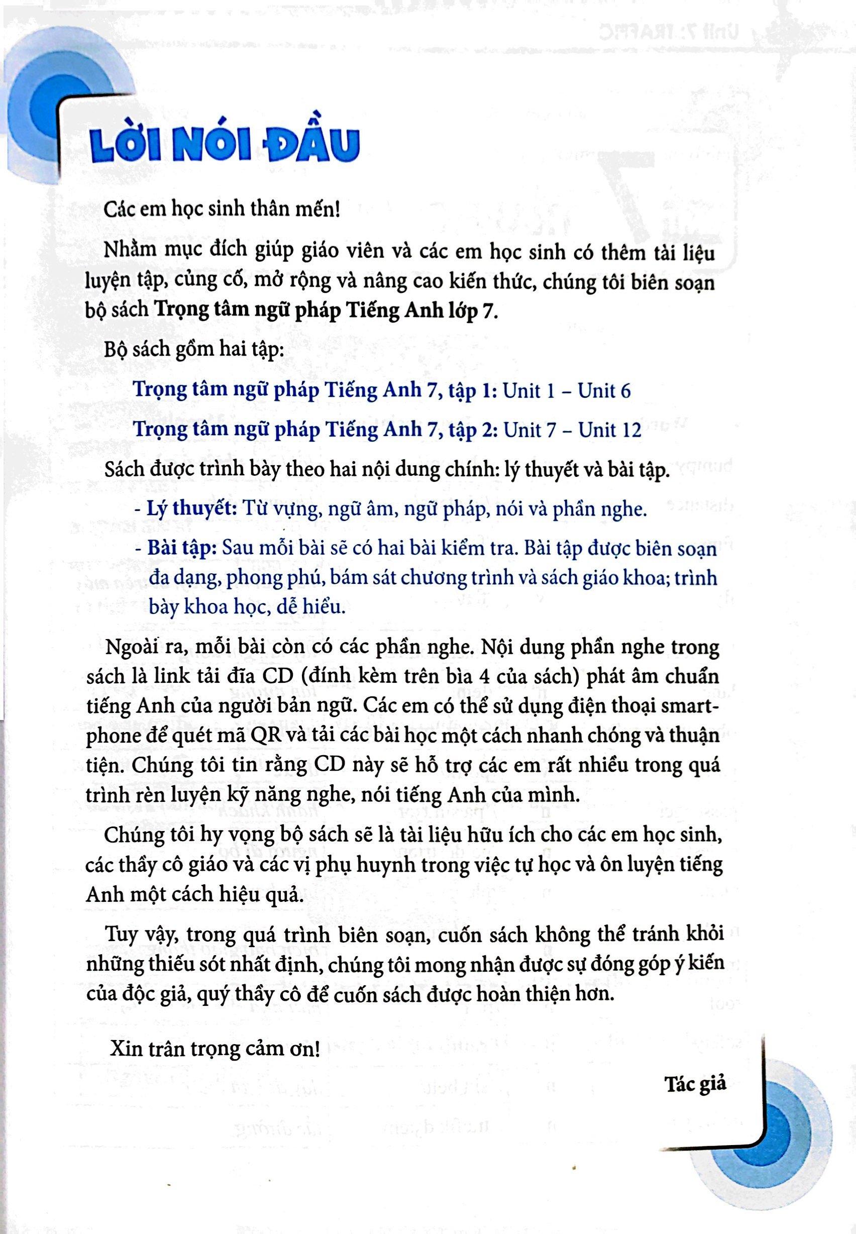 Global Success - Trọng Tâm Ngữ Pháp Tiếng Anh Lớp 7 - Tập 2 - Có Đáp Án Nhằm mục đích giúp giáo viên và các em học sinh có thêm tài liệu luyện tập, củng cố, mở rộng và nâng cao kiến thức, chúng tôi biên soạn bộ sách Trọng tâm ngữ pháp Tiếng Anh lớp 7 tập 2. Bộ sách gồm hai tập: Trọng tâm ngữ pháp Tiếng Anh 7 tập 1: Unit 1 – Unit 6 Trọng tâm ngữ pháp Tiếng Anh 7 tập 2: Unit 7 – Unit 12