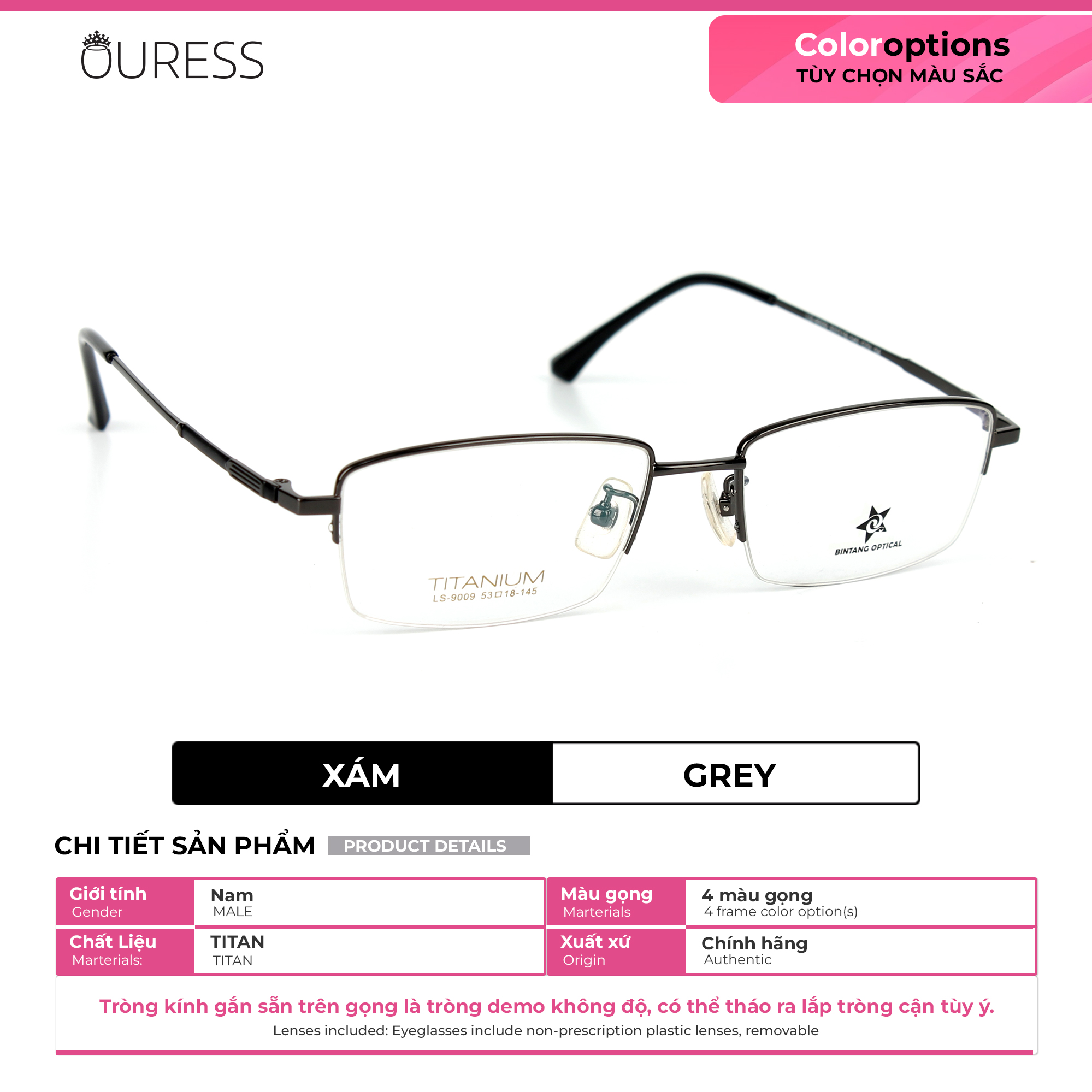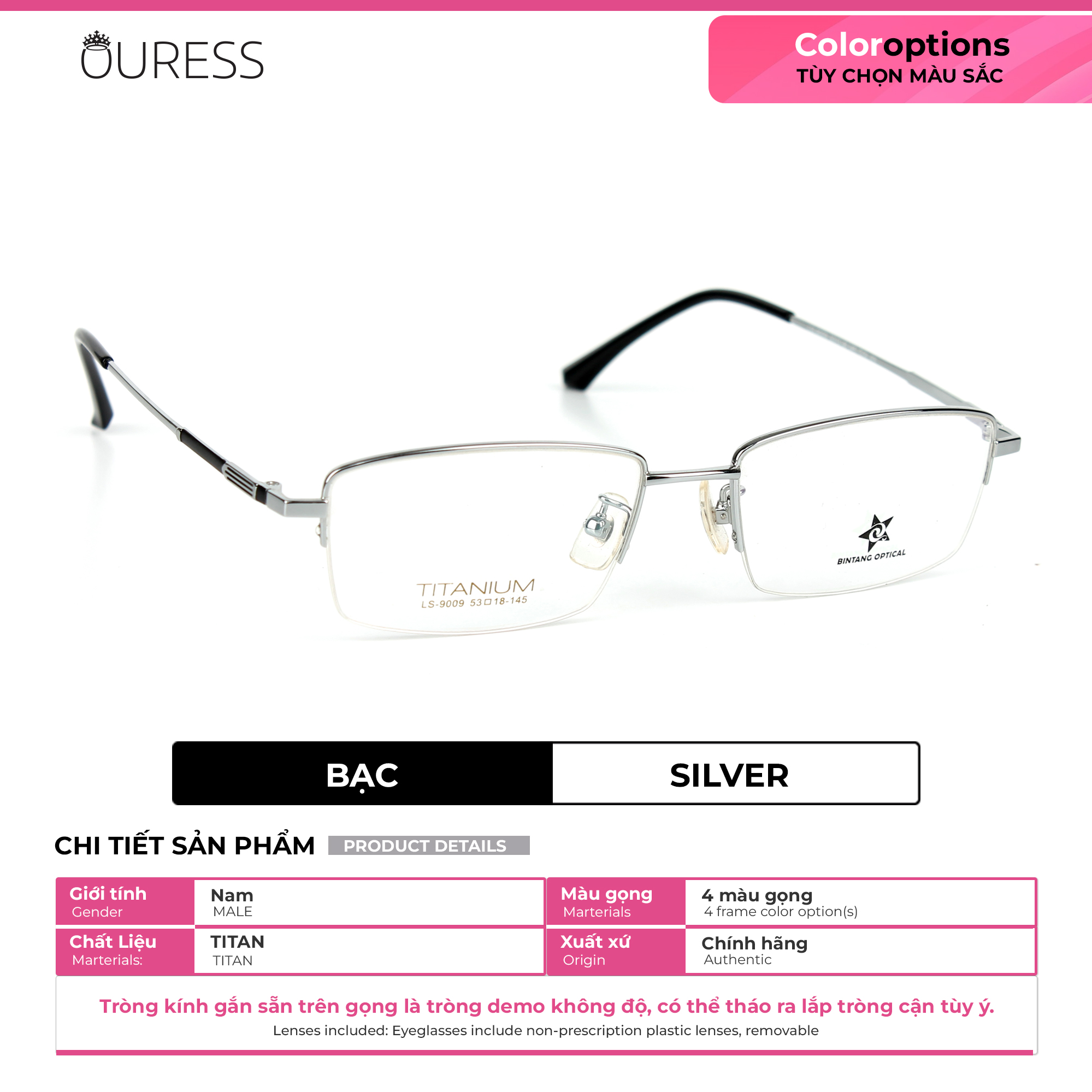 Chất Liệu: titanium hay còn gọi là titan ---------------------- Titan là dòng chất liệu mềm, nhẹ và rất bền. Những loại gọng kính được làm từ titan này sẽ hạn chế được oxi hóa cao và nhẹ hơn so với những gọng kính kim loại thường. Ngoài trọng lượng nhẹ, titan rất ít bị ăn mòn hay hoen gỉ kể cả khi tiếp xúc với axit thông thường. Gọng kính nửa khung (xẻ cước) titan mang nhiều ưu điểm vượt trội hơn các gọng kính thông thường khác. Cụ thể như: Khung gọng kính là loại nửa khung hay còn gọi là xẻ cước, tạo nên nét đẹp thời trang và nhẹ nhàng thanh thoát trên gương mặt Gọng kính được thiết kế tỉ mỉ hơn với vẻ đẹp góc cạnh và đường nét tinh tế, sang trọng,đôi khi có 1 số sản phẩm sẽ kèm những chạm khắc trên gọng kính hoặc càng kính, taọ thêm điểm nhấn cho chiếc kính được sang trọng và tinh tế hơn. Gọng kính có độ bền, và tính đàn hồi cao, khó trầy xước và bong tróc hơn những chiếc kính kim loại khi có tác động ngoại lực . Không bị ăn mòn oxy cao trong quá trình sử dụng, không bị hoen gỉ, xỉn màu . Không gây kích ứng da, kể cả da nhạy cảm . Gọng kính thanh mảnh, nhẹ hơn kim loại tạo cảm giác dễ chịu cho người đeo kính . Thích hợp với mọi lứa tuổi và dễ dùng cho mọi giới tính. Càng kính hoàn toàn rất thanh mảnh và nhẹ, nhưng vẫn giữ được sự chắc chắn của chiếc kính trên gương mặt người đeo Phần đuôi càng kính được bọc nhựa, giúp ôm sát vành tai hơn và hạn chế rơi tuột kính. Ve mũi được cấu tạo bằng nhựa silicon mềm tạo nên sự mềm mại không gây cảm giác khó chịu đau buốt vùng mũi, đặc biệt với người mồ hôi dầu sẽ hạn chế tuột kính nhiều hơn các loại ve mũi khác ==>> Gọng kính nửa khung (xẻ cước) titan thực sự là phụ kiện mang đến sự tự tin, Sang trọng và cao cấp. Chắc chắn sản phẩm sẽ mang đến sự hài lòng và thể hiện được nét riêng về phong cách cũng như sự lịch lãm của bạn!