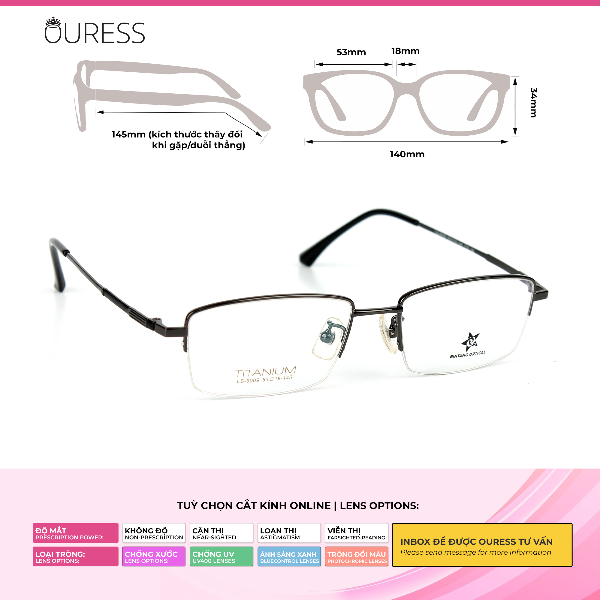 ✨Gọng kính titanium LS9009 nửa khung thời trang nam cao cấp siêu nhẹ siêu bền OURESS