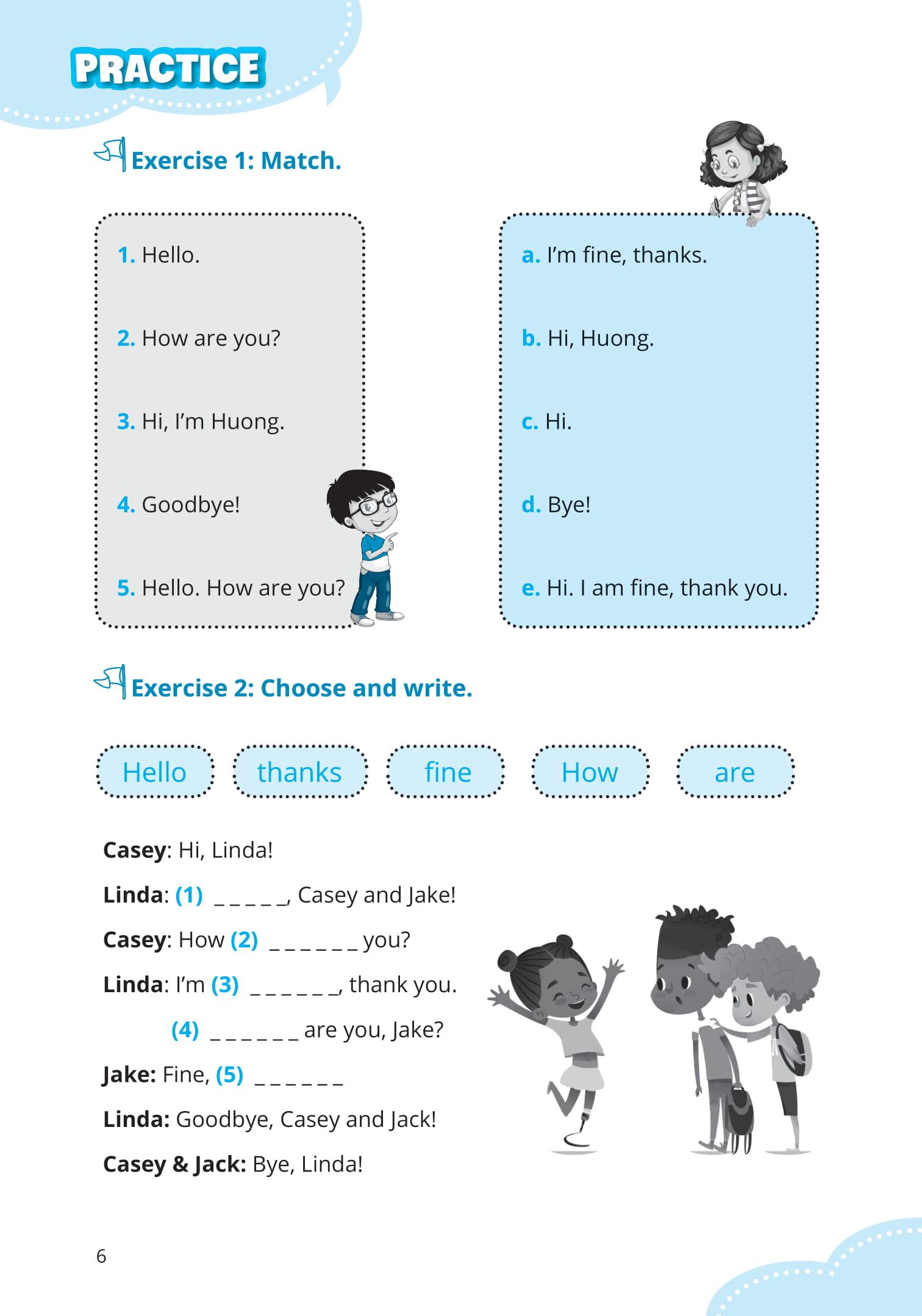 - “Học đi đôi với hành” – Bài tập thực hành đa dạng Để giúp các con hiểu sâu – nhớ lâu kiến thức và áp dụng được vào thực tế, các dạng bài tập thực hành rất phong phú: Bài tập nối (Match), điền từ vào chỗ trống, sửa lỗi sai, hoàn thành câu, dịch nghĩa…