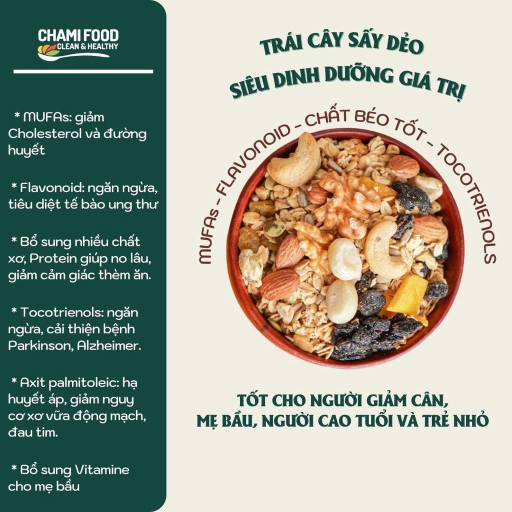 - Granola giúp giảm Cholesterol LDL có hại, ngăn ngừa xơ vữa động mạch, cải thiện huyết áp và đường huyết. Ngoài ra trong granola ăn kiêng CHAMI còn có óc chó và hạnh nhân Mỹ, giúp cung cấp Omega 3 và chất béo tốt. Sử dụng Yến mạch Úc Loại 1 nên Granola ăn kiêng Chami Food thơm bùi, giòn ngon, dễ ăn, không bị hôi và gắt dầu.