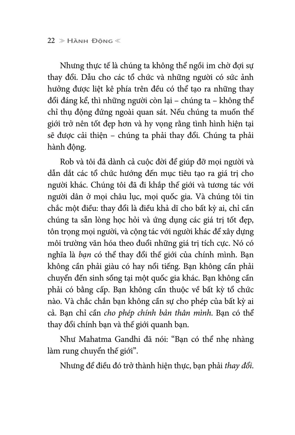 Và quyển sách này – Change Your World: How Anyone, Anywhere Can Make a Difference sẽ giúp bạn mở mang tầm mắt, để bạn có thể nhìn môi trường xung quanh với một góc nhìn thật khác biệt – đó là tiền đề cho quá trình thay đổi cách sống và thậm chí là biến đổi thế giới xung quanh bạn.