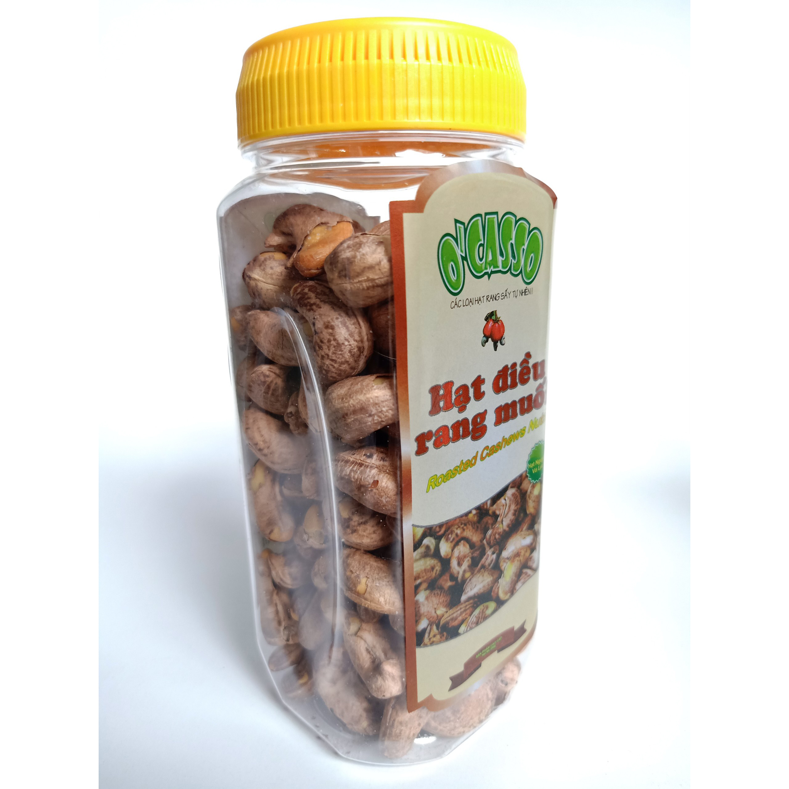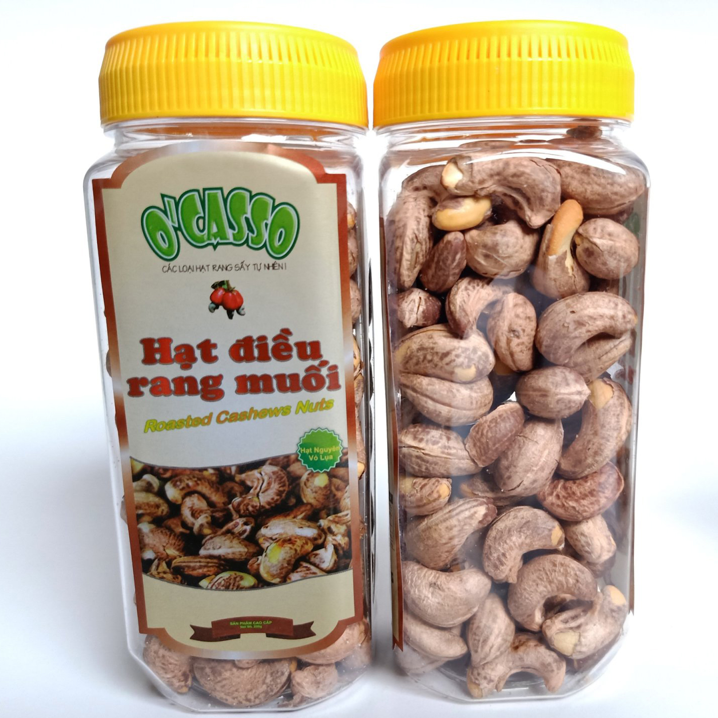 Hạt Điều Rang Muối  loại A O’Casso   Hạt điều lụa rang muối, giờ đây lại là món ăn dân dã rất ngon của người Việt nhưng mang rất nhiều giá trị dinh dưỡng, dần đã trở thành giá trị truyền thống và là đặc sản cho những người xa xứ hay khách phương xa về nước mua làm quà từ Việt Nam.   Nếu bạn thật sự hiểu được nguyên liệu hạt điều, chúng tôi chắn chắn bạn sẽ chọn hạt điều rang muối nguyên liệu Việt Nam 100 phần trăm để dùng hằng ngày hoặc đãi khách. Vì tuy hạt điều Việt Nam không to bằng các loại hạt điều nguyên liệu nước ngoài như của Châu Phi, Ấn Độ, Indonesia, Campuchia, nhưng điều Việt Nam chính gốc lại chắc hạt, cho độ béo bùi rất ngon,  hương vị đậm đà ngọt vị tự nhiên của hạt điều khi ăn.   Bên cạnh đó, hạt điều cần được rang lúc hạt tươi vừa chẻ vỏ còn lớp lụa, nguyên liệu được chọn lựa kỹ ở những vùng đất phù hợp, cùng với công thức chế biến và theo dõi sát sao để cho ra từng mẻ hàng ngon, thật sự đậm đà hương vị điều Việt.   Thương hiệu hạt O’Casso của chúng tôi ra đời từ cảm xúc khi ăn điều Việt. Logo được viết tắt của từ: Oh, Cashew Nuts and Soys.   Thông tin sản phẩm Thành phần  : Hạt điều 90%, muối i-ốt 10% Hướng dẫn bảo quản: bảo quản nơi khô ráo, thoáng mát, tránh ánh nắng trực tiếp Hướng dẫn sử dụng : dùng ngay sau khi mở bao bì Giữ kín bao bì khi không sử dụng Hạn sử dụng 12 Tháng kể từ ngày sản xuất