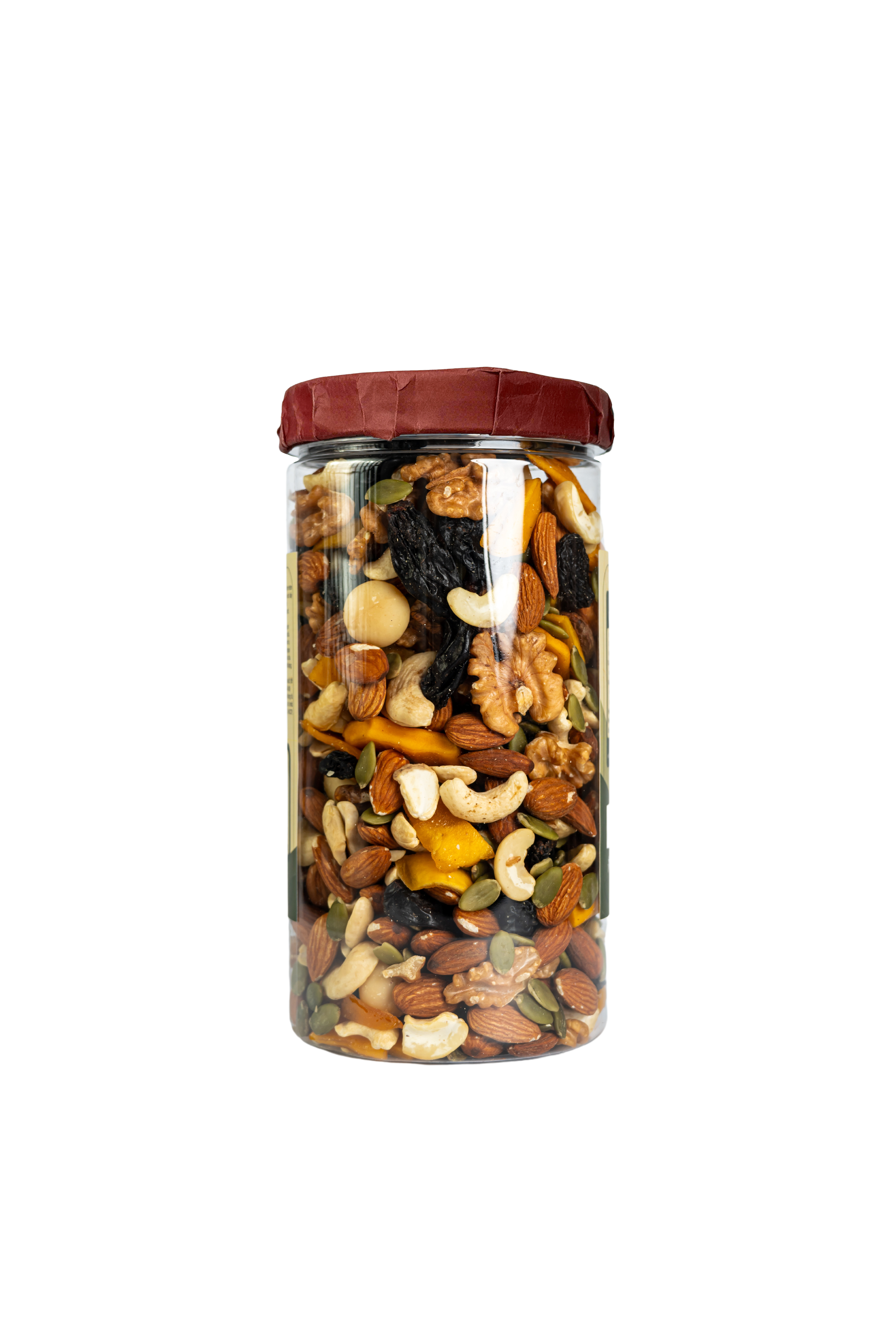 Giới thiệu: Hạt mix ngũ cốc được sản xuất hoàn toàn từ hạt dinh dưỡng (hạt điều, hạnh nhân, nhân óc chó, hạt bí xanh) và trái cây cao cấp xoài sấy, nho đen. Bữa