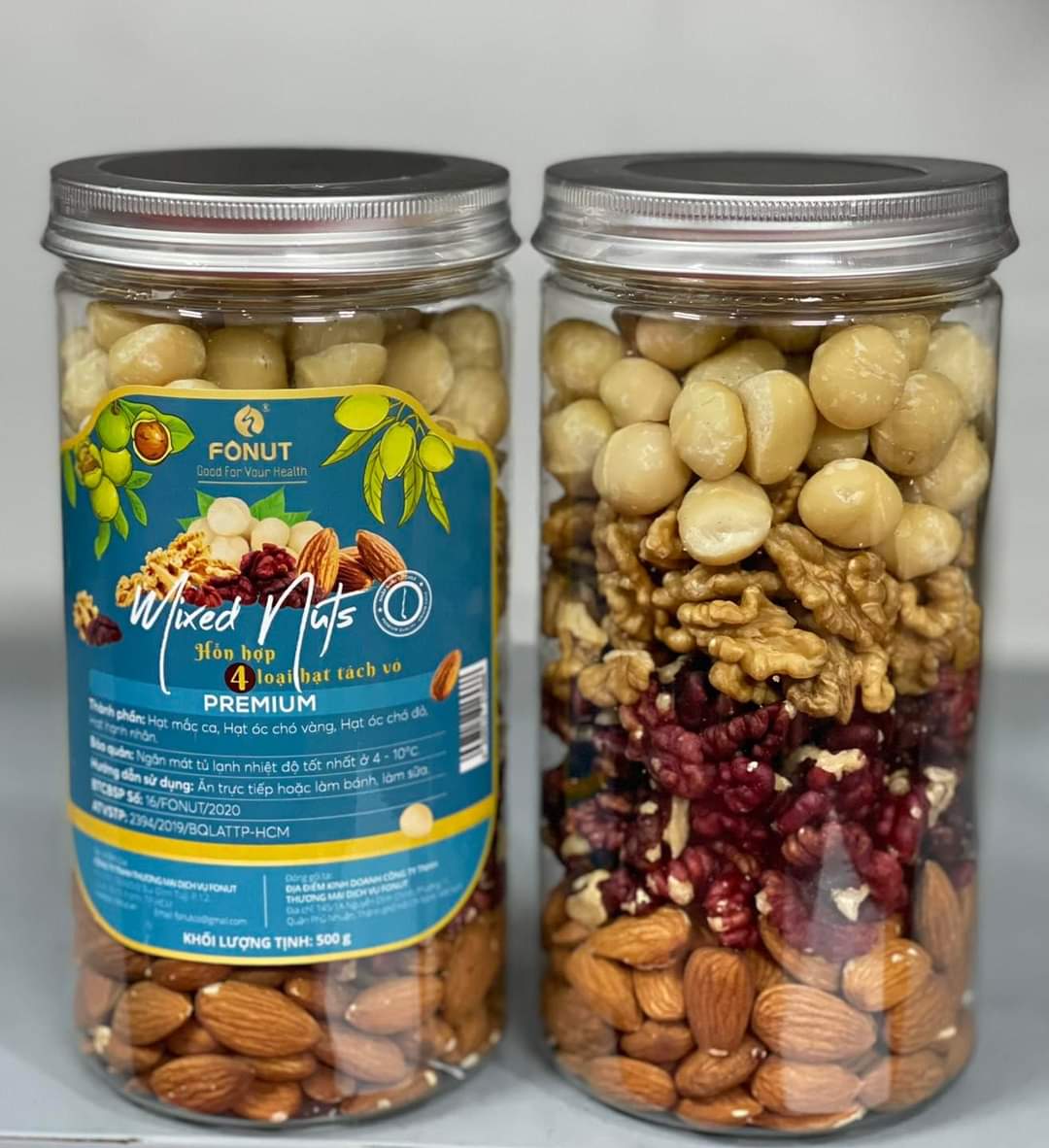 Hạt mix 4 loại hạt dinh dưỡng ️ Xuất xứ: Hạt Macca của Úc, Óc Chó đỏ Mỹ, óc chó vàng Mỹ và Hạnh Nhân của Mỹ, ️ Trọng lượng: Hũ 500gr ️ Giá: 330.000 đ / hũ 500gr ️ HSD: 1 năm (ngày sản xuất và hạn sử dụng có in trên nắp hũ)