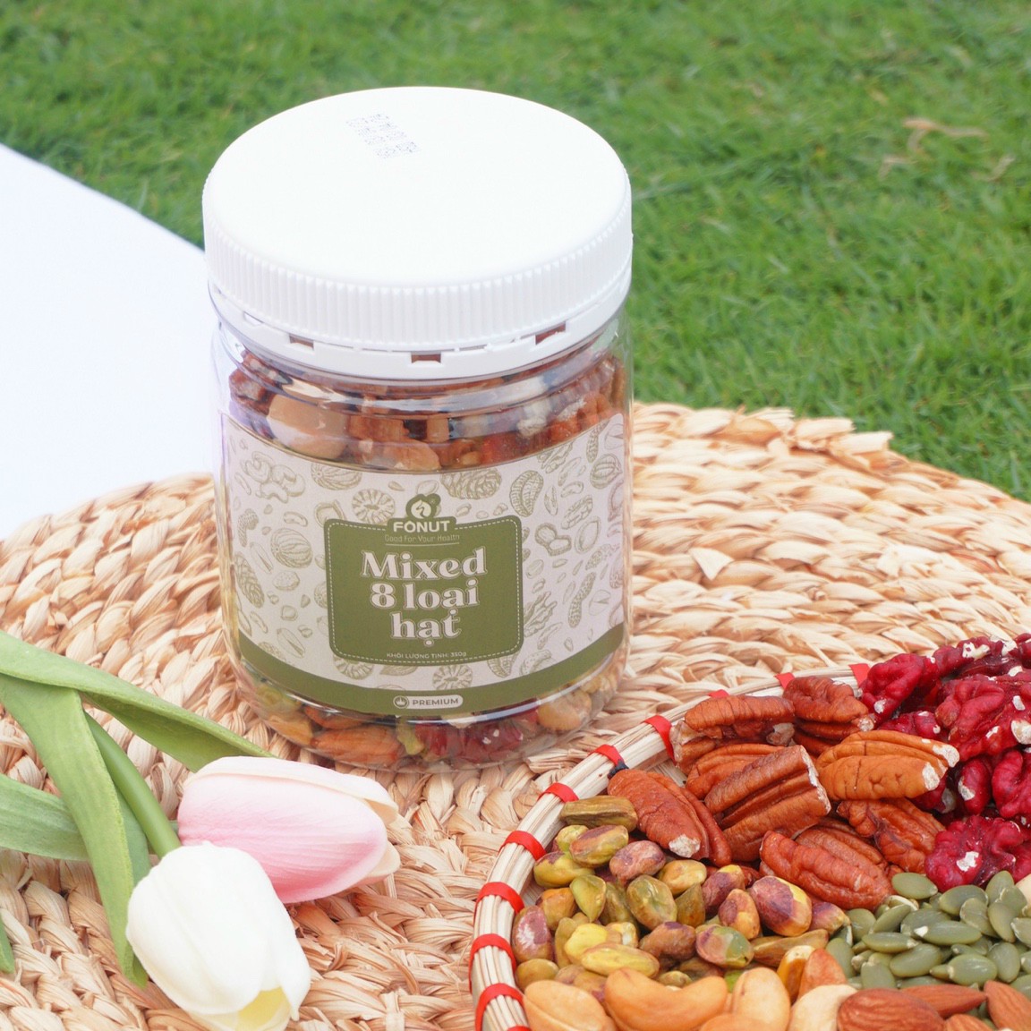 Hạt mix 8 loại hạt dinh dưỡng ️ Xuất xứ: Hạt Macca của Úc, Hạt Điều của Việt Nam, Óc Chó đỏ Mỹ, óc chó vàng Mỹ và Hạnh Nhân của Mỹ, hạt bí xanh