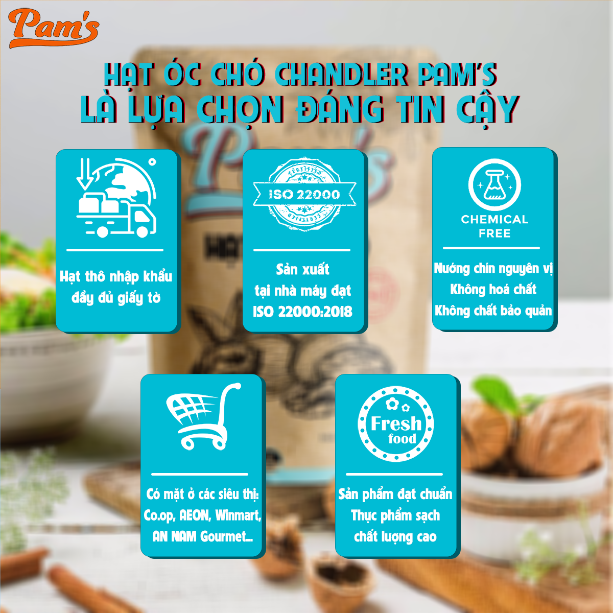 - 100g Hạt óc chó Pam's cung cấp: 710 Calo, 66g Omega3, 11g Carbs, 18g Protein, 101mg Canxi, 2.73g Sắt,