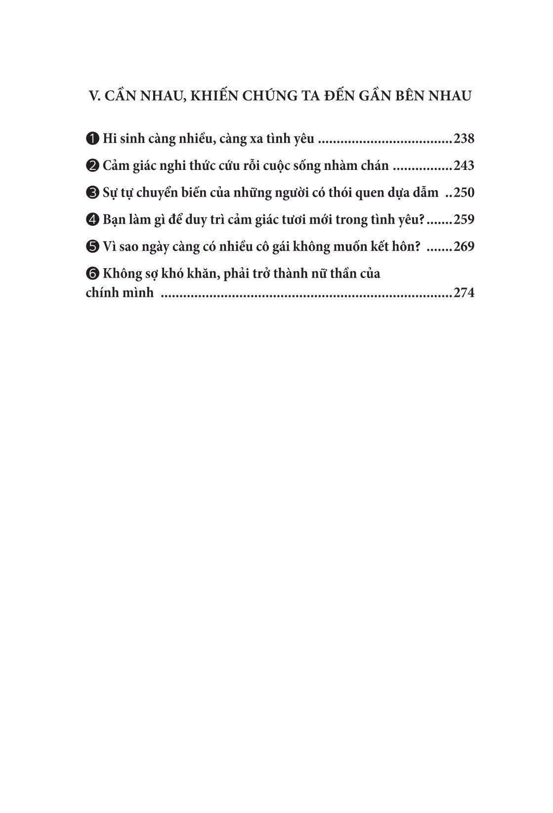 Cuốn sách đi sâu vào phân tích việc xây dựng và tương tác trong mối quan hệ thân thiết giữa con người với con người thông qua kiến thức tâm lý học đại chúng kết hợp với cái nhìn sâu sắc của bản thân với cuộc sống thông qua 5 chương: