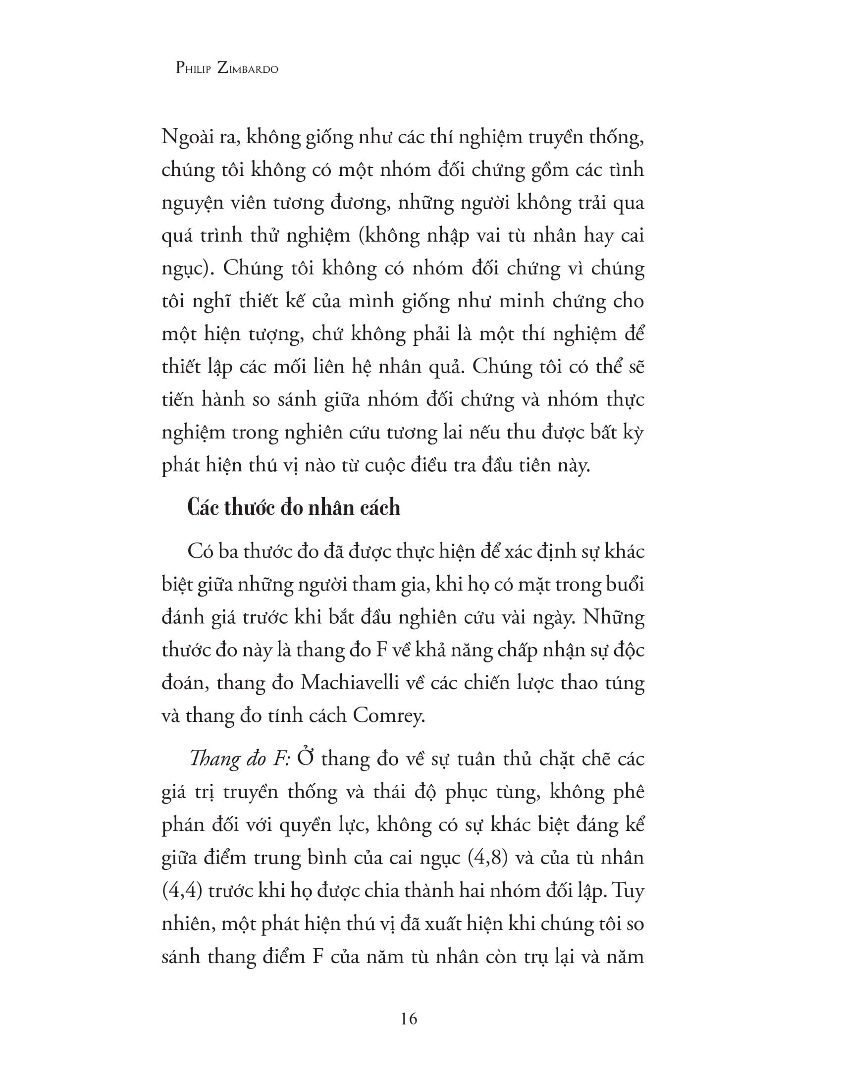 Phần tiếp theo của tập 2 viết về thí nghiệm nhà tù Stanford sẽ kể lại chi tiết tình huống nghiên cứu về sự biến đổi của các sinh viên đại học khi họ được phân công ngẫu nhiên đóng vai tù nhân hoặc cai ngục trong một nhà tù giả. Một trong những kết luận chính từ thí nghiệm nhà tù Stanford là sức mạnh của một loạt biến số hoàn cảnh, dù không biểu hiện rõ ràng nhưng lại có thể chi phối ý chí phản kháng của một cá nhân. Kết luận đó càng được khẳng định hơn trong các chương sách trình bày về hiện tượng này trong các nghiên cứu khoa học xã hội khác. Những người tham gia nghiên cứu - các sinh viên đại học và cả những công dân bình thường - đã thích ứng, tuân thủ, phục tùng và dễ dàng bị dụ dỗ thực hiện những việc mà họ không thể tưởng tượng được là mình sẽ làm khi ở ngoài hoàn cảnh đó. Chúng ta cũng sẽ vượt ra ngoài môi trường thí nghiệm để tìm hiểu về hiệu ứng Lucifer trong thực tế, đặc biệt là câu chuyện về những vụ ngược đãi và tra tấn khủng khiếp các tù nhân tại nhà ngục Abu Ghraib, Iraq. Chúng ta sẽ đào sâu vào địa điểm, con người và hoàn cảnh để đưa ra kết luận về các nguyên nhân dẫn đến những hành vi tàn bạo xuất hiện trong “bộ ảnh chiến tích” mà những người lính đã ghi lại trong quá trình hành hạ tù nhân. Hành trình khắc nghiệt đào sâu đến tận cùng bóng tối sẽ kết thúc trong chương cuối cùng. Khi đó, ta tìm hiểu một số thông tin tích cực về bản chất con người, về những gì mà mỗi cá nhân chúng ta có thể làm để đương đầu với sức mạnh của hoàn cảnh và hệ thống. Trong tất cả những nghiên cứu và các ví dụ thực tế, luôn có một số cá nhân phản kháng và không chịu khuất phục trước cám dỗ. Thứ giúp họ thoát khỏi cái ác không phải là bản tính thiện lành bẩm sinh, mà thường là do sự hiểu biết của họ (dẫu còn khá bản năng) về các chiến thuật phản kháng về mặt tinh thần và xã hội. Cuốn sách cung cấp một số chiến thuật có thể giúp mọi người chống lại những ảnh hưởng xã hội không mong muốn - những giải pháp này dựa trên sự kết hợp giữa kinh nghiệm của tác giả cùng các cộng sự trong chuyên ngành tâm lý xã hội, hay những chuyên gia về ảnh hưởng và thuyết phục. Khi hầu hết mọi người đều chịu khuất phục và chỉ một số ít dám đứng lên, những người bất tuân có thể được coi là anh hùng. Hành trình của cuốn sách này sẽ kết thúc bằng sự tích cực khi tôn vinh bản chất anh hùng tồn tại trong mỗi chúng ta. Trái ngược với “sự tầm thường của cái ác”, lý thuyết cho rằng những người bình thường đều có thể suy đồi và trở nên tàn ác, tác giả Zimbardo đặt ra thuật ngữ “sự tầm thường của chủ nghĩa anh hùng” để tôn vinh mọi người đàn ông và phụ nữ đã tuân theo lời thúc giục đấu tranh vì nhân loại khi đến thời điểm buộc phải hành động. Khi lời kêu gọi đó vang lên, họ biết rằng nó là dành cho mình. Lời thúc giục ấy kêu gọi chúng ta hãy đề cao những phần tốt đẹp nhất trong bản chất con người, vượt lên trên những áp lực mạnh mẽ của hoàn cảnh và hệ thống như một lời khẳng định rằng, phẩm giá con người đủ khả năng để chống lại cái ác. Về tác giả Philip Zimbardo được quốc tế công nhận là “gương mặt đại diện cho tâm lý học đương đại”. Nghiên cứu kinh điển của ông - thí nghiệm nhà tù Stanford - vẫn còn nguyên giá trị tham khảo sau hàng thập kỷ, không ngừng khiến công chúng ngỡ ngàng về sự biến đổi tính cách của con người dưới sự tác động của những yếu tố hoàn cảnh và hệ thống đầy uy lực. Zimbardo là giáo sư của Đại học Stanford từ năm 1968, trước đó từng giảng dạy tại các trường Yale, New York và Columbia. Ông được trao nhiều giải thưởng và danh hiệu vì những cống hiến cho ngành tâm lý học. Những đề tài nghiên cứu ông đặc biệt quan tâm là ý thức về thời gian, sự thuyết phục, sự điên rồ, sự bạo lực, tâm lý chính trị, chủ nghĩa khủng bố và chủ nghĩa anh hùng. Một số lời khen “Hiệu ứng Lucifer sẽ vĩnh viễn thay đổi cách bạn suy nghĩ về lý do khiến chúng ta hành xử theo những cách nhất định, và đặc biệt thay đổi cách bạn suy nghĩ về khả năng gây tội ác của một con người. Đây là một cuốn sách làm ta khó chịu, nhưng cực kỳ cần thiết.” - Malcolm Gladwell “Một cuốn sách quan trọ Tất cả các chính trị gia và nhà bình luận xã hộ đều nên đọc tác phẩm này.” - The Times (London). “Rất chuyên sâ Zimbardo kết hợp một nghiên cứu tâm lý xã hội dày đặc thông tin, đầy thu hút với tinh thần đạo đức chính trực, qua đó thách thức độc giả nhìn xa hơn những lời lên án hời hợt để suy ngẫm về trách nhiệm tập thể của chúng ta đối với những tệ nạn trên thế giới này.” - Publishers Weekly.