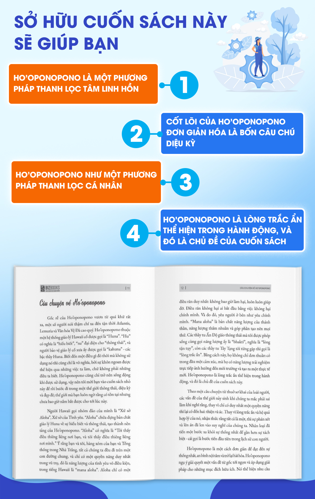Chỉ với 4 câu ngắn ngủi: Tôi xin lỗi, Hãy tha thứ cho tôi, Tôi yêu bạn, Cảm ơn bạn, nhưng chúng chứa đựng toàn bộ những sức mạnh tuyệt vời nhất, giúp bạn tự chữa lành cho chính mình và tha thứ cho những ai đã gây nên thương tổn cho bạn. Ho’oponopono không đơn thuần là một nghi thức, mà đây còn là giá trị sống, giá trị nhân văn mà người Hawaii cổ đã truyền lại cho cuộc sống, hướng con người đến đích đến an yên trong hành trình chữa lành của cuộc đời mình.