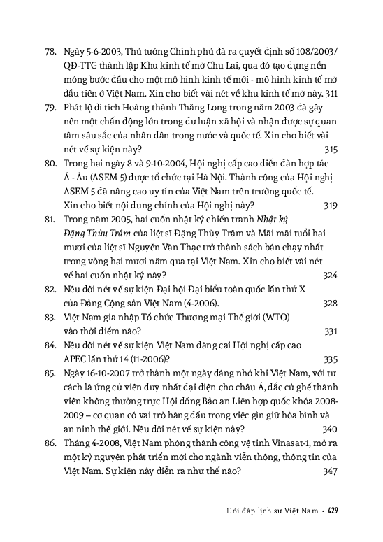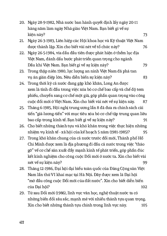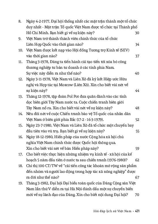 Tất cả những vấn đề này đã được chọn lọc để gói gọn trong 100 câu hỏi đáp, do nhóm Nhân văn trẻ - gồm các giảng viên khoa Sử và Quan hệ quốc tế Trường Đại học Khoa học Xã Hội Nhân Văn thực hiện. Sách có phần phụ lục danh sách những vị lãnh đạo Đảng và nhà nước trong thời kỳ này, đồng thời điểm những sự kiện tiêu biểu nhất qua 37 năm. Mỗi câu hỏi đáp đều có hình ảnh tư liệu minh họa.