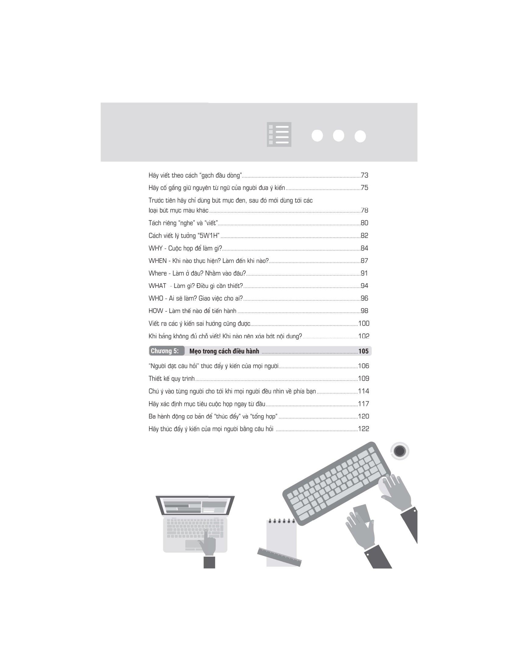 - Chờ đợi các thành viên tham gia cuộc họp, đến giờ họp nhưng còn thiếu thành viên… Để một cuộc họp diễn ra suôn sẻ và hiệu quả không quá khó. Vấn đề nằm ở vai trò của người điều hành và thái độ của các thành viên tham gia. Đã đến lúc bạn không lãng phí thời gian của m.ình vào những buổi họp nhàm chán và phát huy vai trò hiệu quả của các buổi họp. Cuốn sách HỌP ÍT - LÀM NHIỀU là một tài liệu hữu ích dành cho những người muốn tìm hiểu về cách tổ chức các cuộc họp hiệu quả và chuyên nghiệp hơn, nhằm giảm thiểu số lượng, cũng như rút ngắn thời gian của các cuộc họp và nâng cao hiệu quả công việc.