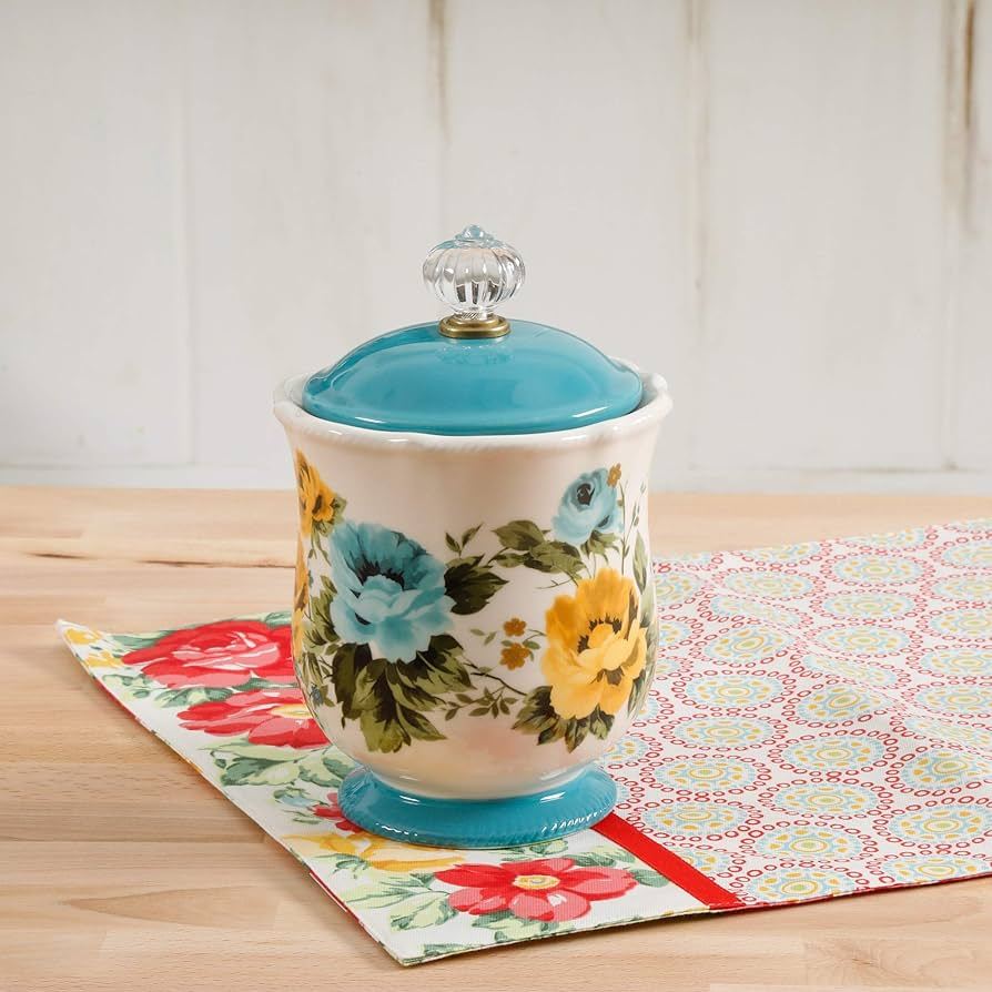 Hũ đựng đồ khô The Pioneer Woman Vintage Floral Canister w lý tưởng để đựng cà phê, trà, bột mì, Lớp nền đẹp mắt có màu xanh mòng két rực rỡ và những bông hoa màu