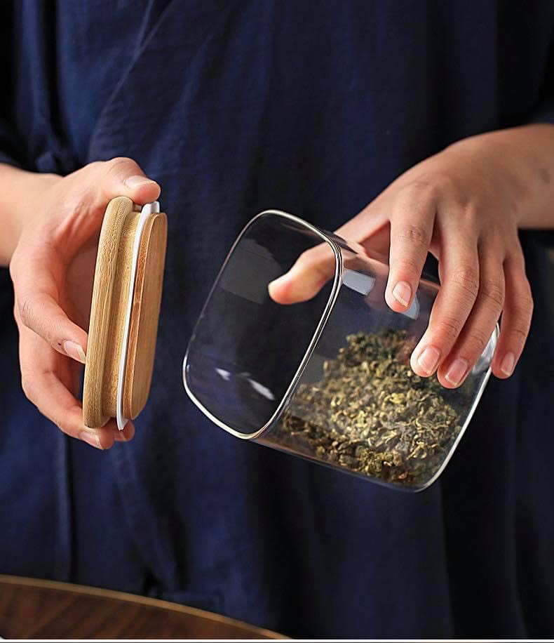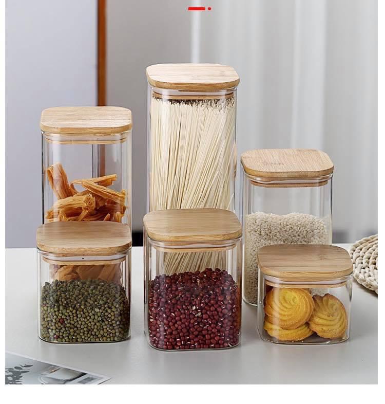 Hũ thuỷ tinh nắp gỗ dáng vuông độc đáo để đựng các loại hạt, đồ khô hay bánh kẹo, mì khô vừa đẹp, lại sạch sẽ, gọn gàng