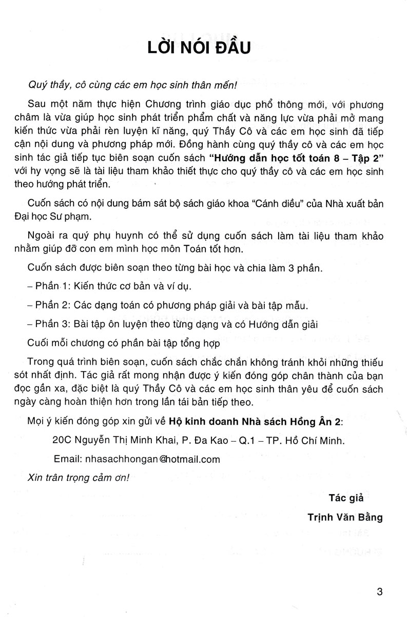 Sau một năm thực hiện chương trình giáo dục phổ thông mới, với phương châm là vừa giúp học sinh phát triển phẩm chất và năng lực vừa phải mở mang kiến thức vừa phải rèn luyện kĩ năng, quý thầy cô và các em học sinh đã tiếp cận nội dung và phương pháp mới. Đồng hành cùng quý thầy cô và các em học sinh, tác giả tiếp tục biên soạn cuốn sách “Hướng dẫn học tốt toán 8 – Tập 2” với hy vọng cuốn sách sẽ là tài liệu tham khảo thiết thực cho quý thầy cô và các em học sinh theo hướng phát triển.