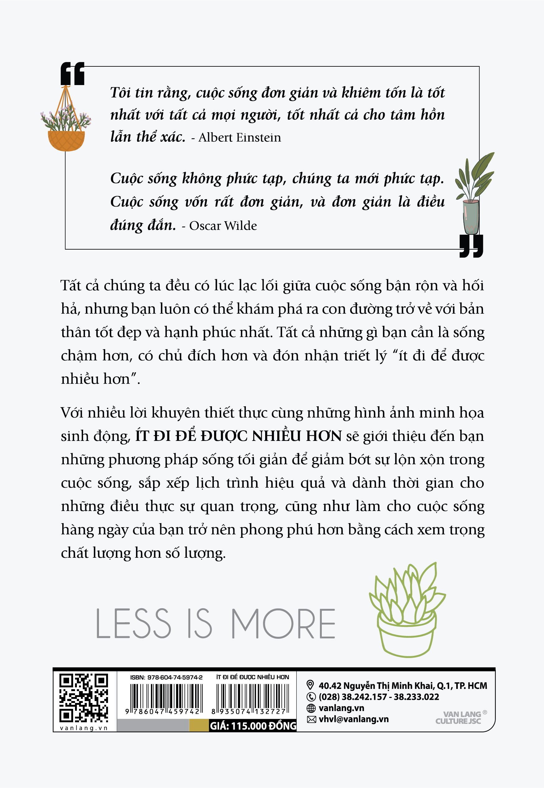 Ít đi để được nhiều hơn-Vanlangbooks I.Giới thiệu sách Ít Đi Để Được Nhiều Hơn - Less Is More “Tôi tin rằng, cuộc sống đơn giản và khiêm tốn là tốt nhất với tất cả mọi người, tốt nhất cả cho tâm hồn lẫn thể xác.”