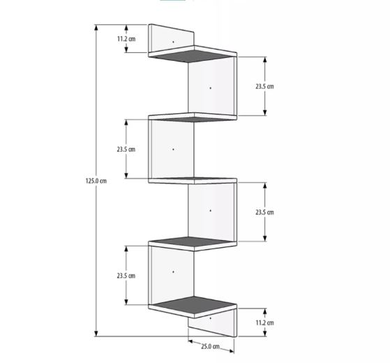 Kệ gỗ treo góc tường thiết kế với 5 tầng, chiều cao mỗi tầng 25cm cho khả năng lưu trữ được nhiều sách, đồ trang trí nhiều kích thước. Kích thước 125 x 25 x 25cm (Cao x Rộng x Sâu) Màu sắc Vân gỗ sồi/ Đen Chất liệu Gỗ MDF lõi xanh chống ẩm, độ dày 17mm, bề mặt phủ melamine đồng màu, căng phẳng có khả năng kháng nước, hạn chế trầy xước, lau sạch dễ dàng.