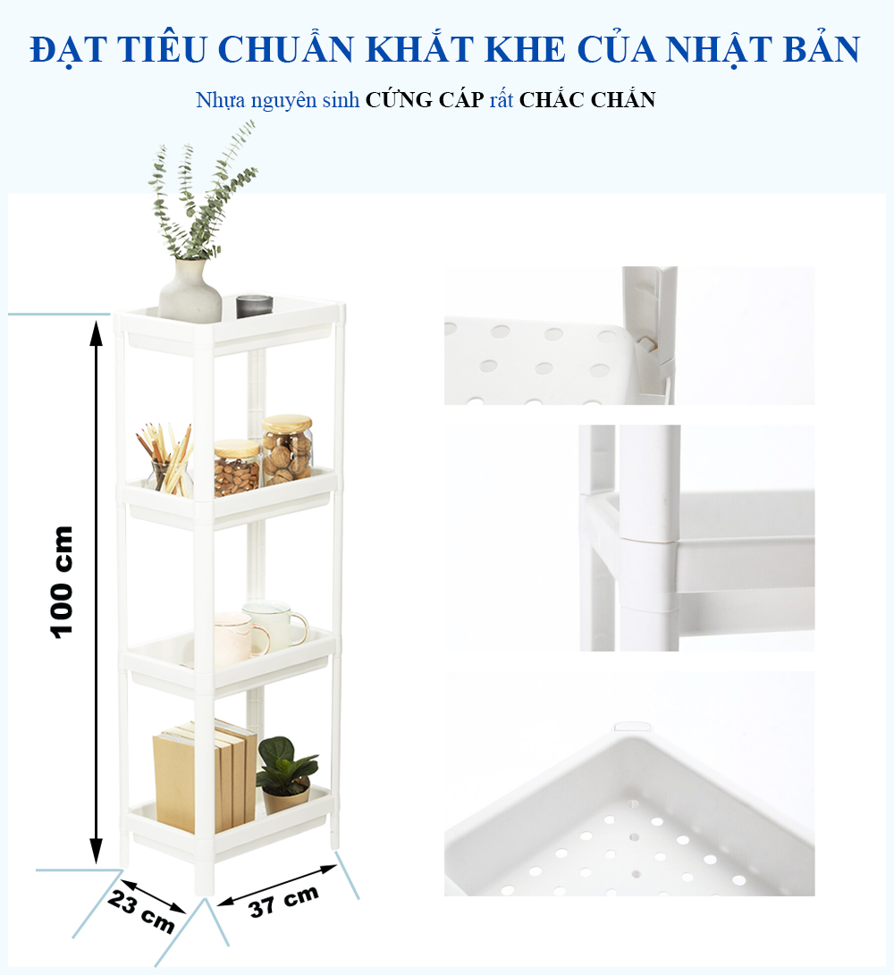 Thông tin sản phẩm: Thiết kế hiện đại, tháo lắp dễ dàng Kết cấu chắc chắn, chịu lực tốt Dễ dàng tùy biến cho nhiều không gia Kích thước: Chiều dài 38cm x chiều sâu 23cm x chiều cao 1,3m Chất liệu: Sản phẩm sản xuât từ nhựa nguyên sinh cao cấp xuất sứ Nhật Bản Màu sắc: Trắng Hiện đại Có thể làm kệ nhà tắm kệ phòng khách kệ đựng Sách Tùy theo nhu cầu sử dụng Phong cách: Hiện đại