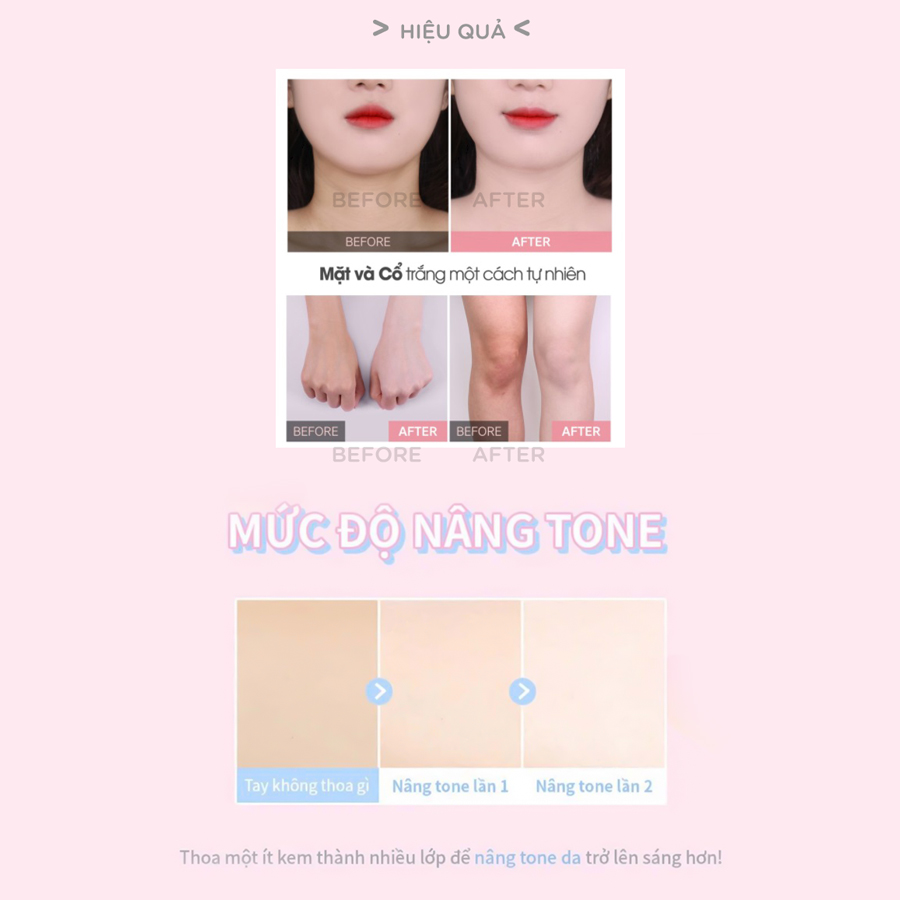 Giúp da trắng sáng bật tông ngay sau khi sử dụng với chất kem thấm nhanh, không gây cảm giác nhờn rít khó chịu, đem lại làn da mịn mượt như lụa.