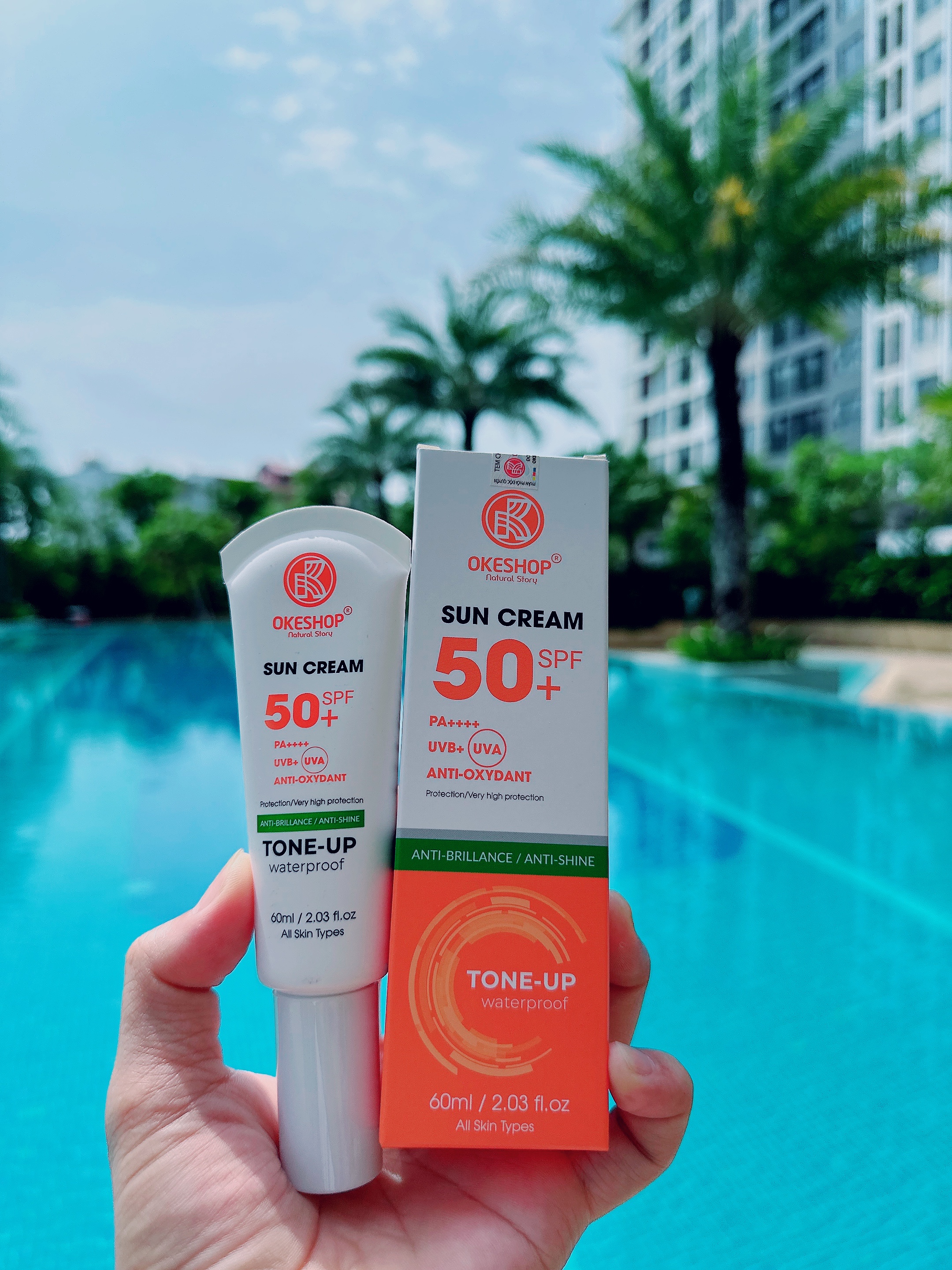 Thoải mái tận hưởng những chuyến du lịch ngoài trời mà không phải lo làn da bị đen sạm nữa, là sản phẩm chống nắng cho mọi loại da OKESHOP SPF 50+ PA++++ Anti-oxydant sẽ là lựa chọn tối ưa cho ngày hè sắp tới Chống nắng TONE-UP OKESHOP SPF 50+ PA++++ Anti-oxydant 60ml Ngày nay trên thị trường mỹ phẩm có vô vàn các sản phẩm kem chống nắng nếu vẫn chưa biết lựa chọn sản phẩm nào để sử dụng thì hãy thử dòng sản phẩm kem chống nắng nâng tông của OKESHOP chắc chắn đây sẽ là sản phẩm khiến bạn cảm thấy hài lòng. CÔNG DỤNG TONE-UP OKESHOP SPF 50+ PA++++ Anti-oxydant 60ml SUN CREAM OKESHOP SPF 50+ PA++++ Anti-oxydant 60ml giúp ngăn chặn 99% tia UV với chỉ số chống nắng cao SPF50+ PA++++ chống được tối đa tia UVA/UVB ngay cả khi bạn không trang bị cho mình đầy đủ áo, khẩu trang khi ra ngoài. OKESHOP SPF 50+ PA++++ Anti-oxydant 60ml giúp bảo vệ làn da của bạn an toàn dưới ánh nắng mặt trời mà vẫn dịu nhẹ, không gây hại cho da. Chỉ số SPF 50+ cho khả năng chống tia UVB trong thời gian dài bảo vệ làn da không bị cháy nắng, sạm đen. Chỉ số PA++++ ngăn chặn triệt để tia UVA - là tác nhân gây nên hiện tượng lão hóa da sớm như hình thành nếp nhăn, đốm nâu. SUN CREAM OKESHOP sẽ giúp nuôi dưỡng cho làn da bạn luôn ẩm mượt, gia tăng độ đàn hồi, chống oxi hóa, tăng cường sức khỏe cho da khỏe mạnh, bảo vệ da khỏi những tác động tiêu cực từ môi trường. Đồng thời, kem chống nắng còn bổ sung lượng nước, cấp ẩm dồi dào giúp làn da mềm mại, mượt mà hơn với chiết xuất dưỡng da từ thiên nhiên của hoa trà xanh, nha đam, hắc mai biển mang lại cho các nàng một cảm giác thoải mái dịu nhẹ thanh mát trong cả ngày dài Một điểm cộng của TONE-UP OKESHOP SPF 50+ PA++++ Anti-oxydant 60ml nữa đó chính là khả năng chống thấm nước, mồ hôi và kể cả lượng dầu nhờn tiết ra trên da nên chúng ta không phải lo lắng lớp kem chống nắng sẽ bị trôi mất. Cũng chính vì tính năng thẩm thấu sâu vào bên trong bề mặt da nhanh chóng nên đây sẽ là sản phẩm lý tưởng để sử dụng mỗi khi đi tắm biển, bơi lội hay tiếp xúc môi trường nước. HƯỚNG DẪN SỬ DỤNG: