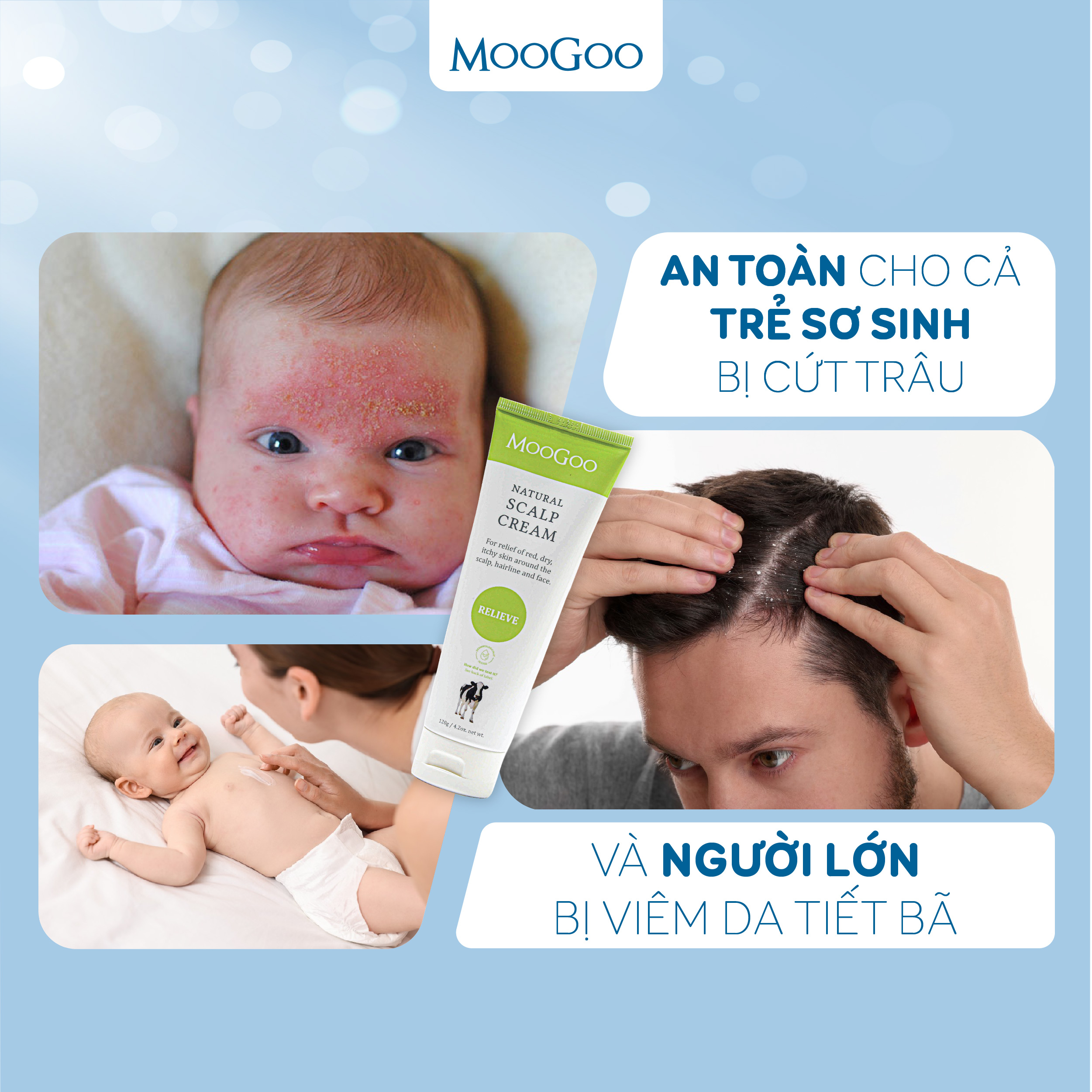 Với tinh dầu tràm giúp làm ấm cơ thể sau khi tắm, đồng thời dưỡng da và làm giảm triệu chứng ngứa và viêm da quanh da đầu, tai, chân tóc, mắt và dọc theo một bên mũi ✓ Có thể sử dụng như một loại kem dưỡng ẩm để giữ cho da đủ độ ẩm và khỏe mạnh đồng thời kết hợp với tinh dầu tràm giúp làm ấm cơ thể. ✓ Giảm tình trạng viêm da xung quanh khu vực da đầu, tai, vùng gần chân tóc, mắt và dọc theo hai bên cánh mũi. ✓ Giảm tình trạng viêm da tiết bã nhờn. Trọng lượng: 120gr Xuất xứ: Australia Kem dưỡng ẩm giữ ấm, hỗ trợ điều trị viêm da đầu tiết bã MooGoo Scalp Cream 120g là một sản phẩm dưỡng ẩm tự nhiên nhưng đồng thời được bổ sung các tác dụng chính giúp làm dịu, cải thiện tình trạng viêm da tiết bã nhờn và trả lại làn da khỏe mạnh ở các khu vực như vùng da đầu, chân tóc, cổ , cổ tay. cổ chân hoặc vùng da xung quanh mũi và miệng . Kem trị viêm da tiết bã MooGoo cho mọi lứa tuổi và kể cả trẻ sơ sinh, viêm da cơ địa ✓ Sản phẩm đã được kiểm nghiệm lâm sàng bởi da liễu và nhi khoa ✓ Có chứa dầu dưỡng tự nhiên ✓ Chứa chất bảo quản tự nhiên từ hoa bia, không chứa Paraben và Phenoxyethanol ✓ Thích hợp cho da nhạy cảm, dễ kích ứng ✓ Không thử nghiệm trên động vật HƯỚNG DẪN SỬ DỤNG  Sử dụng được cho mọi loại da Làm sạch vùng da trước bị viêm, sau đó lấy một lượng kem vừa đủ thoa và mát xa vùng da bị viêm cho đến khi kem được thẩm thấu hết và không còn cảm giác nhờn rít. Bạn cũng có thể sử dụng như một sản phẩm dưỡng da thông thường. Sản phẩm chỉ sử dụng ngoài da, không bôi vào các vết thương hở hoặc vùng mắt và miệng. CẢNH BÁO  Sản phẩm thân thiện với môi trường và không chứa các chất độc hại như Paraben, Parafin, dầu khoáng, thành phần gốc silicone, chất gây kích ứng Phthalate và Phenoxyethanol. *Lưu ý: Phenoxyethanol là hoạt chất gây độc và có hại cho trẻ sơ sinh, ăn phải có thể làm suy giảm hệ thống thần kinh, gây kích ứng da phát ban da, nổi chàm… Giải pháp tự nhiên thích hợp cho mọi người và mọi loại da, kể cả trẻ sơ sinh. Thoa lên bất cứ khi nào bạn muốn, kể cả mặt.