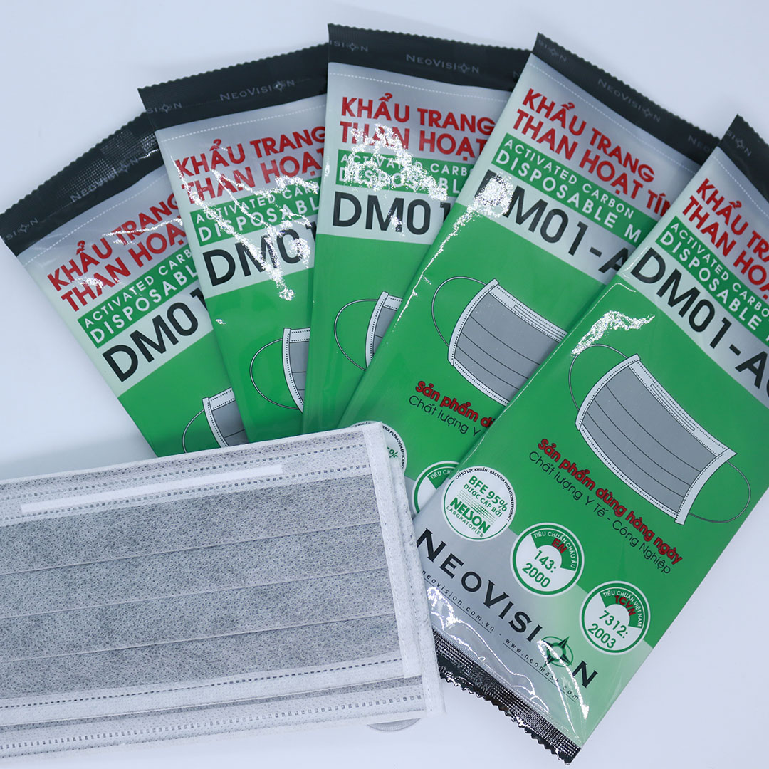 Cấu tạo khẩu trang y tế than hoạt tính NeoVision DM01- AC Khẩu trang than hoạt tính NeoVision DM01-AC (cái) là một trong những sản phẩm khẩu trang dùng một lần phổ biến, được nhiều người tiêu dùng ưa chuộng. Khẩu trang than hoạt tính DM01 bao gồm 4 lớp: