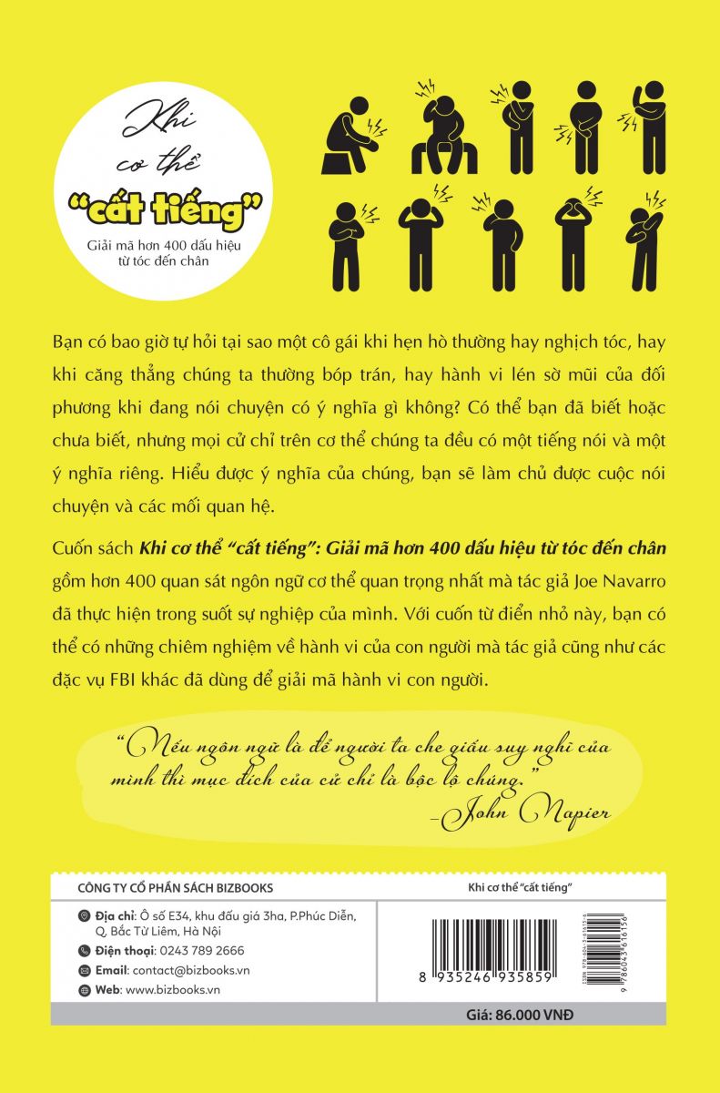 Để bất kỳ ai cũng trở nên thật tinh tường nên cuốn sách Khi cơ thể “cất tiếng” đã ra đời và được săn đón vô cùng rộng rãi bởi sự thú vị và diệu kỳ mà nó mang lại. Tác giả đã sắp xếp theo các vùng cơ thể đi từ đầu xuống chân – Gồm hơn 400 quan sát ngôn ngữ cơ thể quan trọng nhất mà ông cùng các đặc vụ FBI khác đã dùng để giải mã hành vi con người trong suốt sự nghiệp của mình.