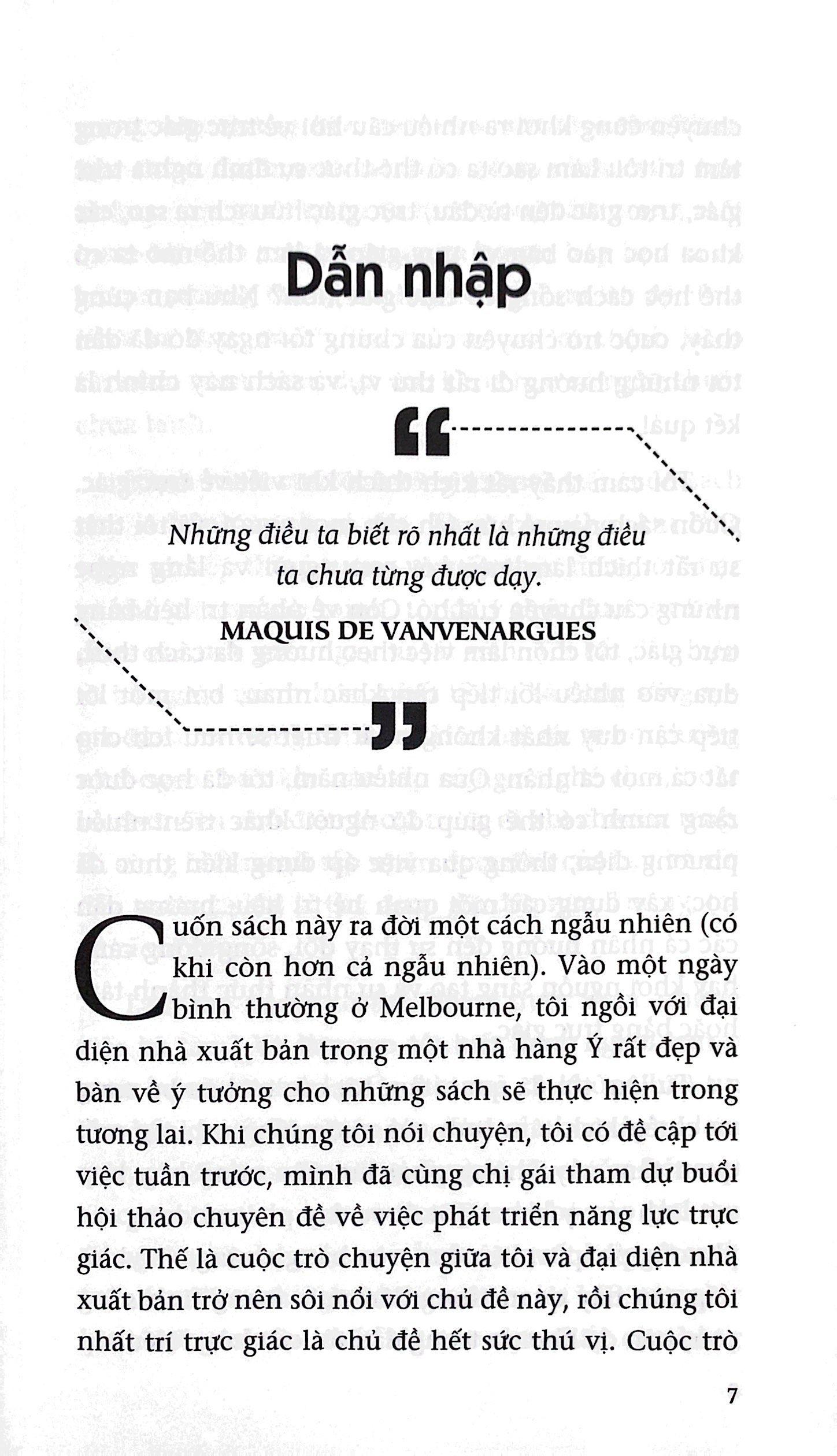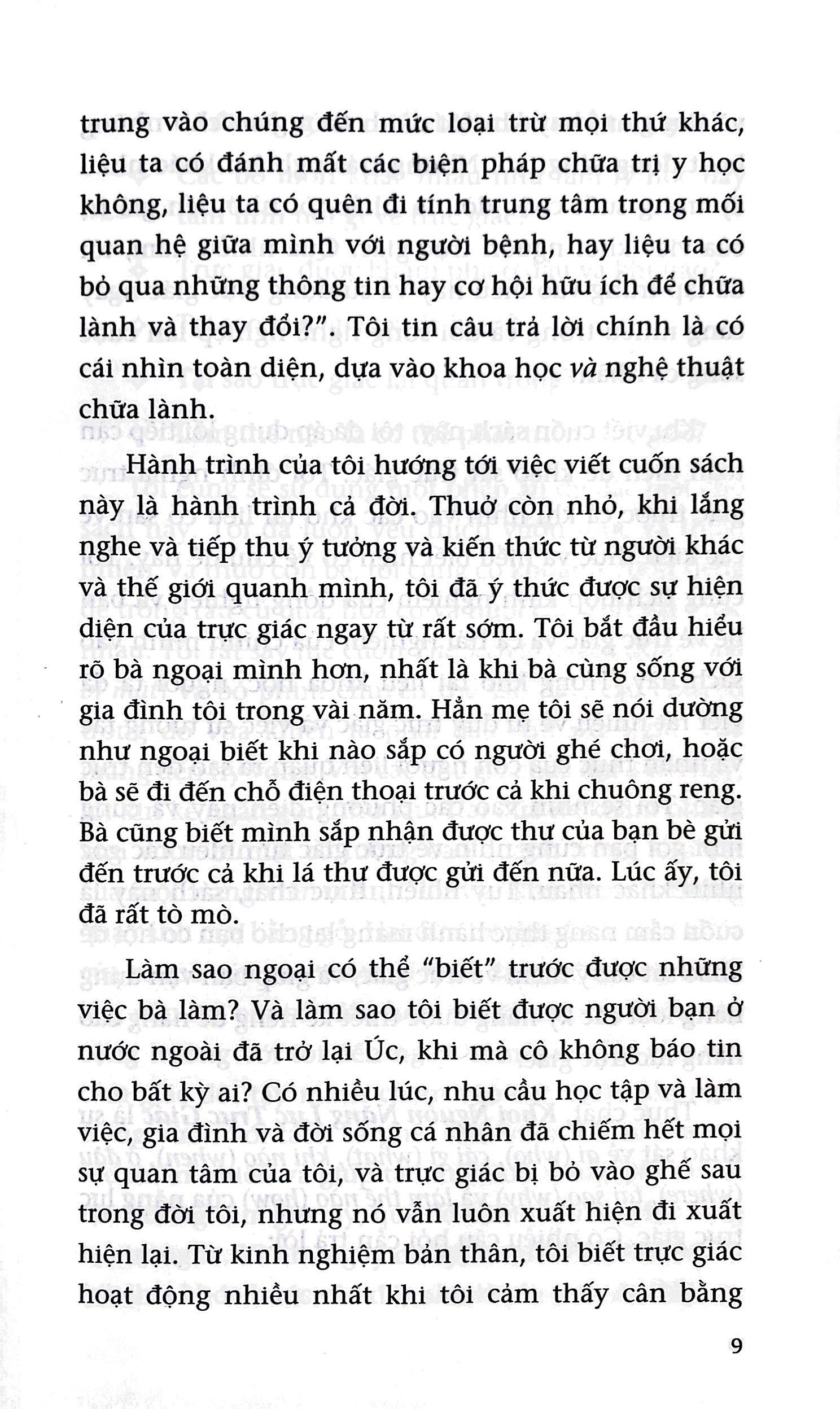 - Bác sĩ Cate Howell, Khơi Nguồn Năng Lực Trực Giác Trực giác là điều hầu hết mọi người sẽ trải nghiệm trong đời, vào lúc này hoặc lúc khác. Đó là linh cảm, là tiếng nói nội tâm hay “giác quan thứ sáu”. Nhưng liệu ta có thể chủ động phát triển trực giác và học cách ứng dụng nó tốt hơn cho cuộc sống? Bác sĩ Cate Howell tin là ai cũng có thể! Trong cuốn sách lý thú này, bác sĩ Howell khám phá trực giác là một phần của triết học, tâm lý học, tôn giáo và tâm linh từ cổ xưa cho đến hiện đại như thế nào. Bà cũng tìm hiểu về khoa học đằng sau trực giác, và cách mô tả kinh nghiệm trực giác theo chức năng não bộ. Cuối cùng, bà vạch ra chương trình bảy bước nhằm phát triển và sử dụng trực giác giúp cải thiện cuộc sống hàng ngày, để mỗi người cảm nhận được sự bình yên, niềm hạnh phúc và mục đích đời m.ình."