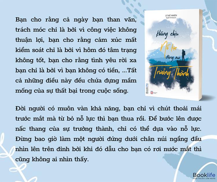 Mỗi người đều có một cái “kén” trói buộc mình, trước khi phá kén, đều sống cuộc đời giống như con sâu vậy. Cái kén này có thể là gia cảnh nghèo khó, là cuộc sống đơn điệu mỗi ngày, là những tiếng cãi lộn không điểm dừng của bố mẹ, là cuộc hôn nhân thất bại, là công việc không chút khởi sắc, là căn nhà có thể mãi mãi cũng không mua nổ Trong chiếc kén như thế này, nếu như chúng ta ngủ nướng, có thể chúng ta không hề cảm thấy khó chịu là bao, nhưng một khi chúng ta bắt đầu suy nghĩ thì sẽ lập tức cảm nhận được sự đau khổ khi bị trói buộc. Nó vây hãm chúng ta, khiến chúng ta không thể cử động, vì thế trong cuộc sống có vô số lần chúng ta rơi vào bế tắc, chỉ biết thở dài mà không biết tương lai rồi sẽ ra sao. Làm thế nào chúng ta mới có thể phá kén mà giương cánh bay cao, thật sự trải nghiệm được cảm giác tự do bay lượn giữa đất trời bao la? Không chịu nỗ lực đừng mơ trưởng thành sẽ giúp bạn giải đáp câu hỏi ấy. Chúng ta cần phải khắc phục ảnh hưởng của ngoại cảnh, khắc phục sự do dự, lười biếng, băn khoăn và lo lắng. Bất kể thế giới bên ngoài có biến hóa như thế nào, người có tinh thần tự thúc đẩy, cuối cùng đều sẽ nghe theo trái tim mình, cho dù đối mặt với tình trạng biến hóa nhanh chóng thế nào đi chăng nữa, rơi vào hoàn cảnh khó khăn như thế nào chăng nữa, cũng sẽ âm thầm chịu đựng, một mình tiến về phía trước. Đời người có muôn vàn khả năng, bạn chỉ vì chút thoải mái trước mắt mà từ bỏ nỗ lực thì bạn thua rồi. Để bước lên được nấc thang của sự trưởng thành, chỉ có thể dựa vào nỗ lực. Đừng bao giờ làm một người đứng dưới chân núi ngẩng đầu nhìn lên trên đỉnh bởi khi đó dẫu cho bạn có rơi nước mắt thì cũng không ai nhìn thấy. Trưởng thành là không ngừng cố gắng, không ngừng nỗ lực, không ngừng kiên trì để vươn lên. Thông tin tác giả: Lý Hủ Nhiên là VVIP trên diễn đàn Zhihu, có hàng triệu fan hâm mộ. Tài khoản cá nhân “Hủ tiên sinh” được Notesandbox và Newrank đánh giá là “một trong mười tài khoản Wechat đáng giá nhất” trong lĩnh vực kỹ năng nơi công sở. Sáng tác rất nhiều tác phẩm hot có danh tiếng tốt, được chia sẻ trên tường của các tài khoản lớn như Nhật báo Nhân dân, Youshu, Duzhe, Master I