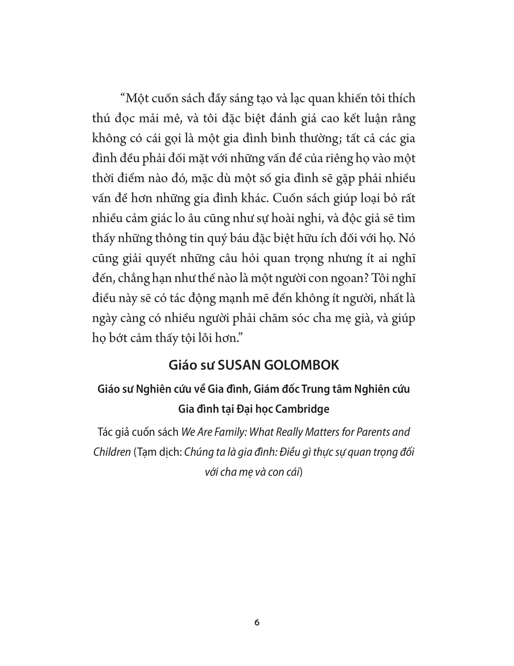 Cuốn sách Không Gia Đình Nào Hoàn Hảo sẽ giúp bạn loại bỏ cảm giác lo âu, sự hoài nghi. Khắc phục cả việc lí tưởng hóa lẫn tiêu cực hóa, cuốn sách sẽ thay đổi cách chúng ta nghĩ và viết về gia đình. Đây là cuốn sách hữu ích cho bất kì ai quan tâm đến việc tìm hiểu thêm về gia đình của chính họ.