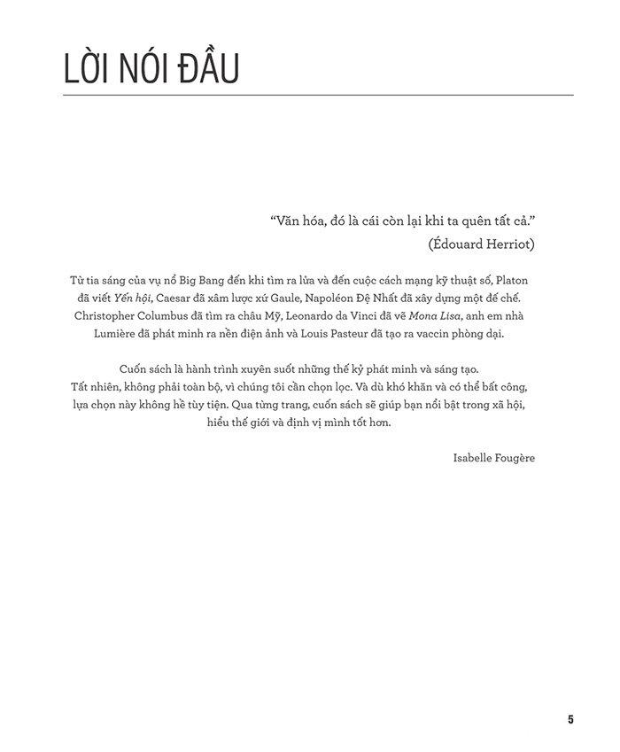 - Bạn có biết mười giai đoạn then chốt trong quá trình phát triển của loài người, của y học và lịch sử khoa học? Theo dòng lịch sử văn hóa sẽ giúp bạn khám phá hoặc khám phá lại tất cả các khái niệm quan trọng nhất về văn hóa: những thần thoại quan trọng, những trào lưu văn học lớn nhất, những hệ thống triết học chủ đạo và những người sáng lập, những khám phá cơ bản, những kỷ lục khó tin nhất, những nghệ sĩ tiêu biểu nhất, những khái niệm then chốt của khoa họ Nhờ bức tranh toàn cảnh tổng hợp về những sự kiện lớn, những phát minh làm thay đổi thế giới, những nhân vật nổi bật, bạn sẽ biết mọi thứ về nghệ thuật và văn học, điện ảnh và thể thao, lịch sử và địa lý qua từng thế kỷ. TÁC GIẢ: Isabelle Fougère là nhà báo và nhà văn tự do người Pháp đã cộng tác với nhiều tờ báo, tạp chí, và kênh truyền hình lớn như Arte, TV5 Monde, France Culture hay Le Figaro Magazine. Cô là tác giả của nhiều cuốn sách phi hư cấu, tiểu luận và sách cho trẻ em, trong đó có Lại là các câu hỏi vì sao và Vì sao? thuộc xê ri “Hỏi đáp cùng em”. Cô đồng sáng lập và tổ chức giải Canon dành cho nữ phóng viên ảnh tại lễ hội Visa pour l'image, do Hiệp hội các nhà báo nữ trao tặng và Tạp chí Figaro hỗ trợ. Ngoài ra, cô còn dành nhiều năm hoạt động vì nhân quyền và phụ nữ. "