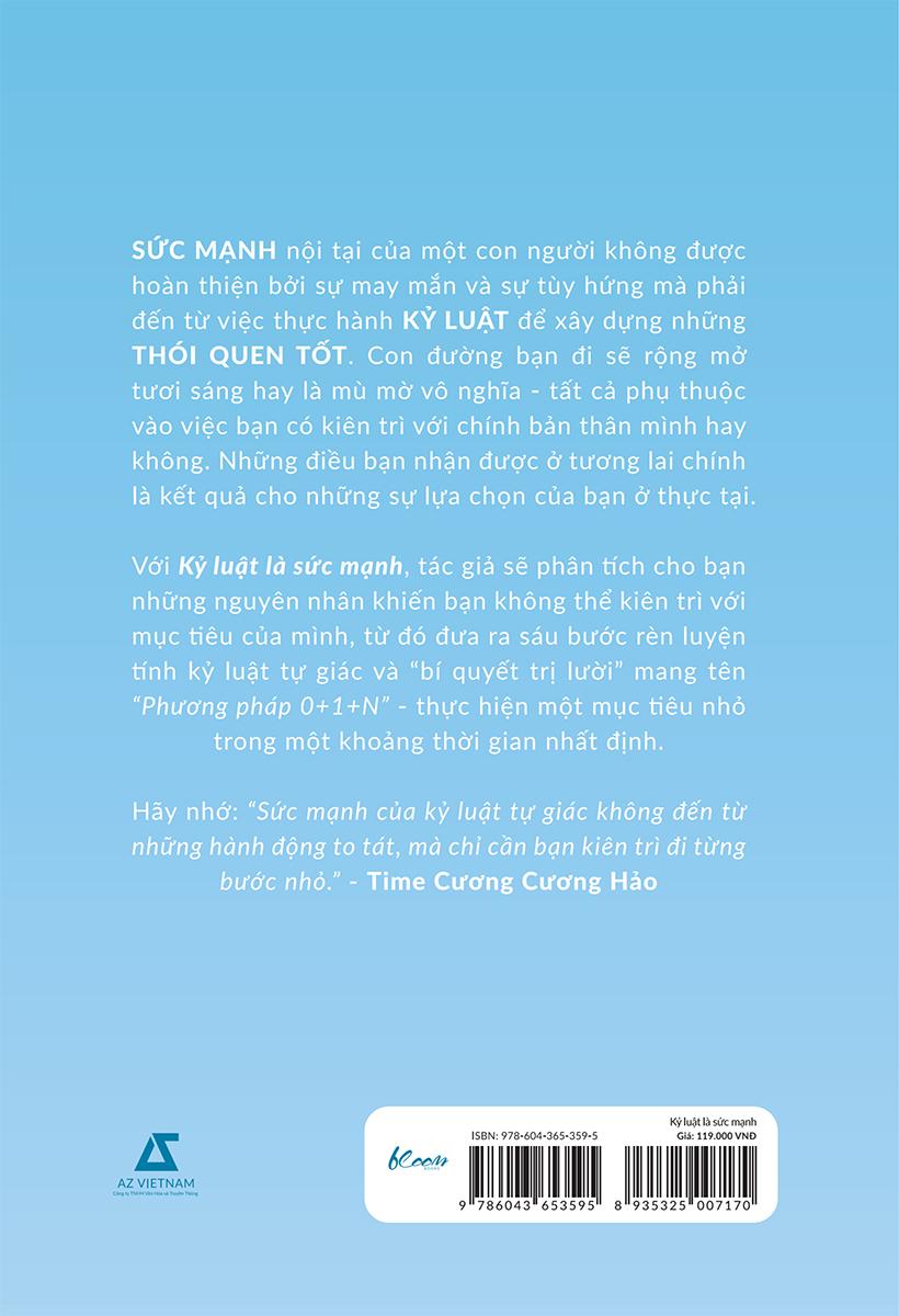 Với cuốn sách Kỷ luật là sức mạnh, tác giả sẽ phân tích cho bạn những nguyên nhân khiến bạn không thể kiên trì với mục tiêu của mình, từ đó đưa ra sáu bước rèn luyện tính kỷ luật tự giác và “bí quyết trị lười” mang tên “Phương pháp 0+1+N” - thực hiện một mục tiêu nhỏ trong một khoảng thời gian nhất định.