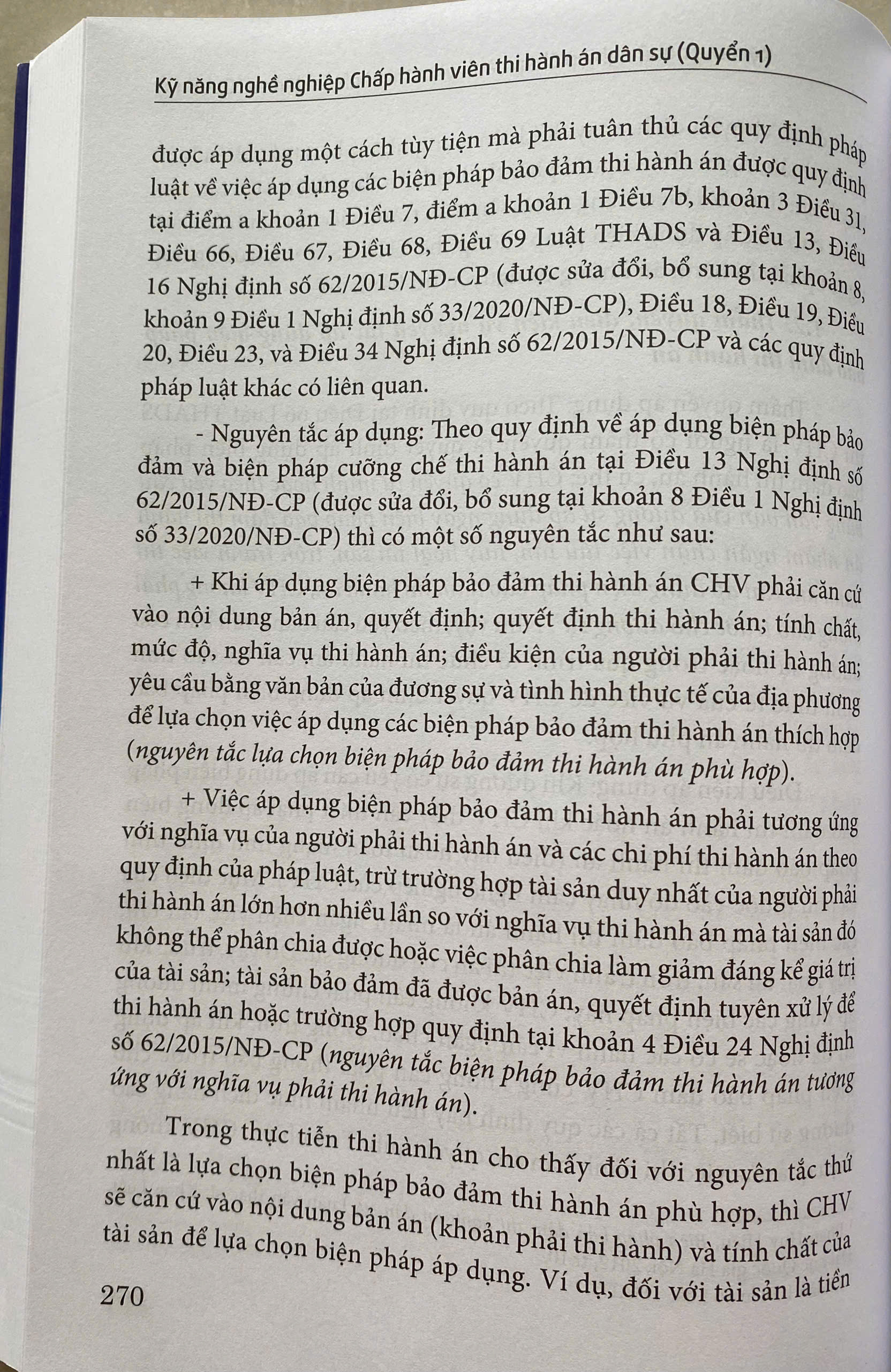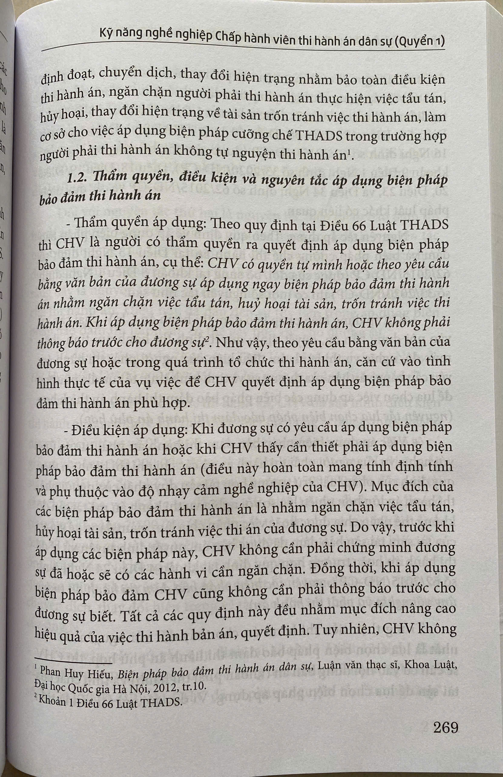 Nhà Xuất bản Tư pháp và Nhóm tác giả: Ths. GV.Hoàng Thị Thanh Hoa, Ths. Hồ Quân Chính, TS. Nguyễn Văn Nghĩa xin trân trọng giới thiệu tới Quý bạn đọc cuốn sách mới “Kỹ năng nghề nghiệp Chấp hành viên Thi hành án Dân sự” Đây là cuốn sách chứa đựng những kỹ năng quan trọng và thiết yếu có giá trị tham khảo và ứng dụng cao đối với Chấp hành viên Thi hành án Dân sự trong quá trình tổ chức thi hành án. Cuốn sách dày 600 trang, kết cấu được xây dựng bám theo thủ tục THADS trên cơ sở cập nhật tất cả các văn bản pháp luật về THADS và các lĩnh vực pháp luật khác có liên quan được áp dụng đối với từng thủ tục một cách chi tiết giúp người đọc dễ dàng tra cứu. Những giá trị quý báu mà cuốn sách mang đến cho bạn đọc: ứng với mỗi tác nghiệp của Chấp hành viên đều được chỉ rõ cơ sở pháp lý; thủ tục thi hành án được phân tích chặt chẽ trên cơ sở quy định của pháp luật; cùng với những điểm nhấn cần lưu ý khi áp dụng pháp luật và những kinh nghiệm thực tiễn vào việc tổ chức thi hành án; trang bị những “kỹ năng mềm” cần thiết trong quá trình tổ chức thi hành án. Bên cạnh ý nghĩa là một cuốn sách “kỹ năng nghề” của Chấp hành viên, cuốn sách còn có giá trị tham khảo đối với những người làm công việc chuyên ngành Tư pháp như Kiểm sát viên, Thẩm phán, Thừa phát lại… và các học viên chuyên ngành Luật cũng như đông đảo Quý độc giả. Nhóm tác giả hy vọng cuốn sách “Kỹ năng nghề nghiệp Chấp hành viên thi hành án dân sự” sẽ là người bạn đồng hành tin cậy đối với đồng nghiệp công tác trong hệ thống Thi hành án dân sự và đông đảo Quý bạn đọc quan tâm!