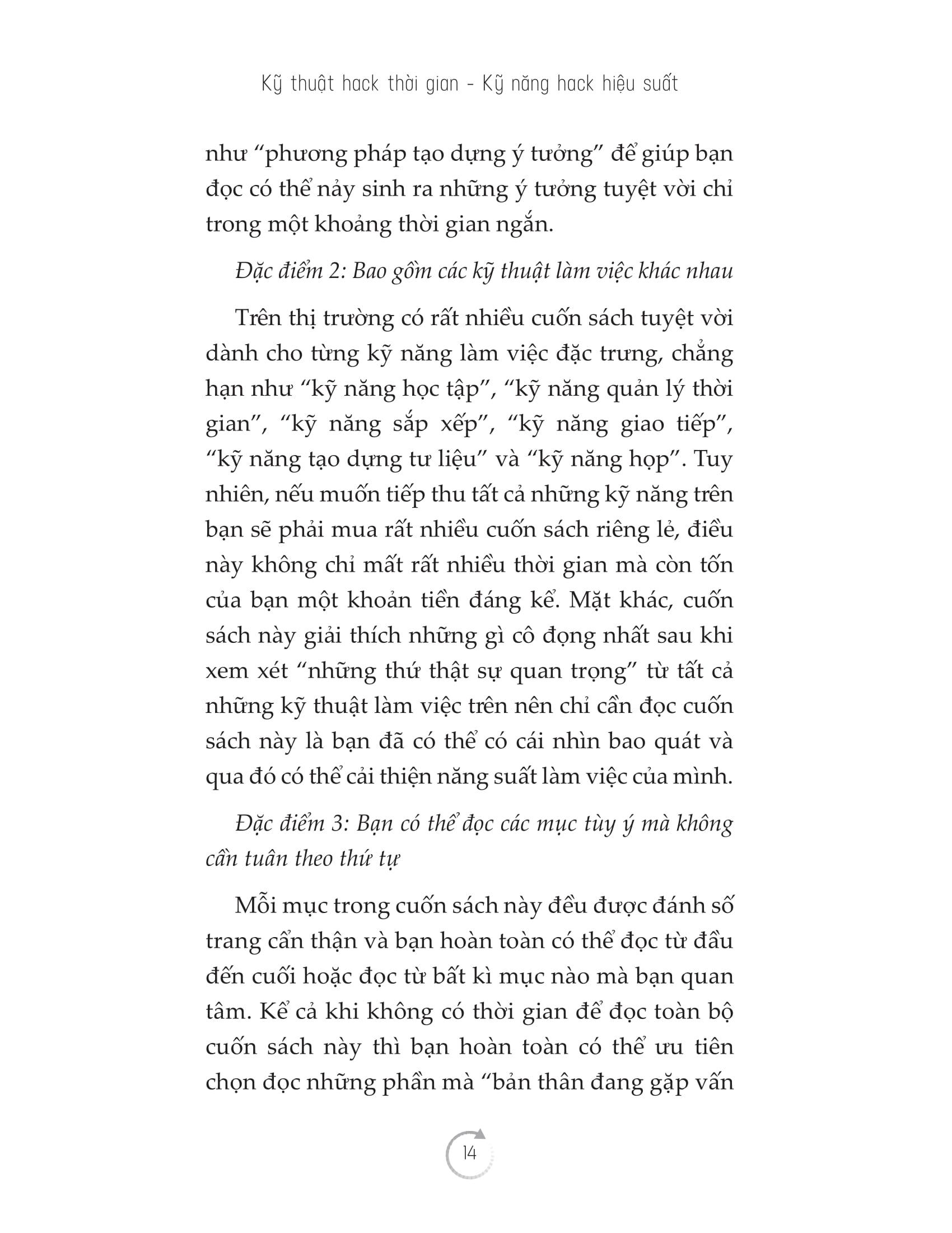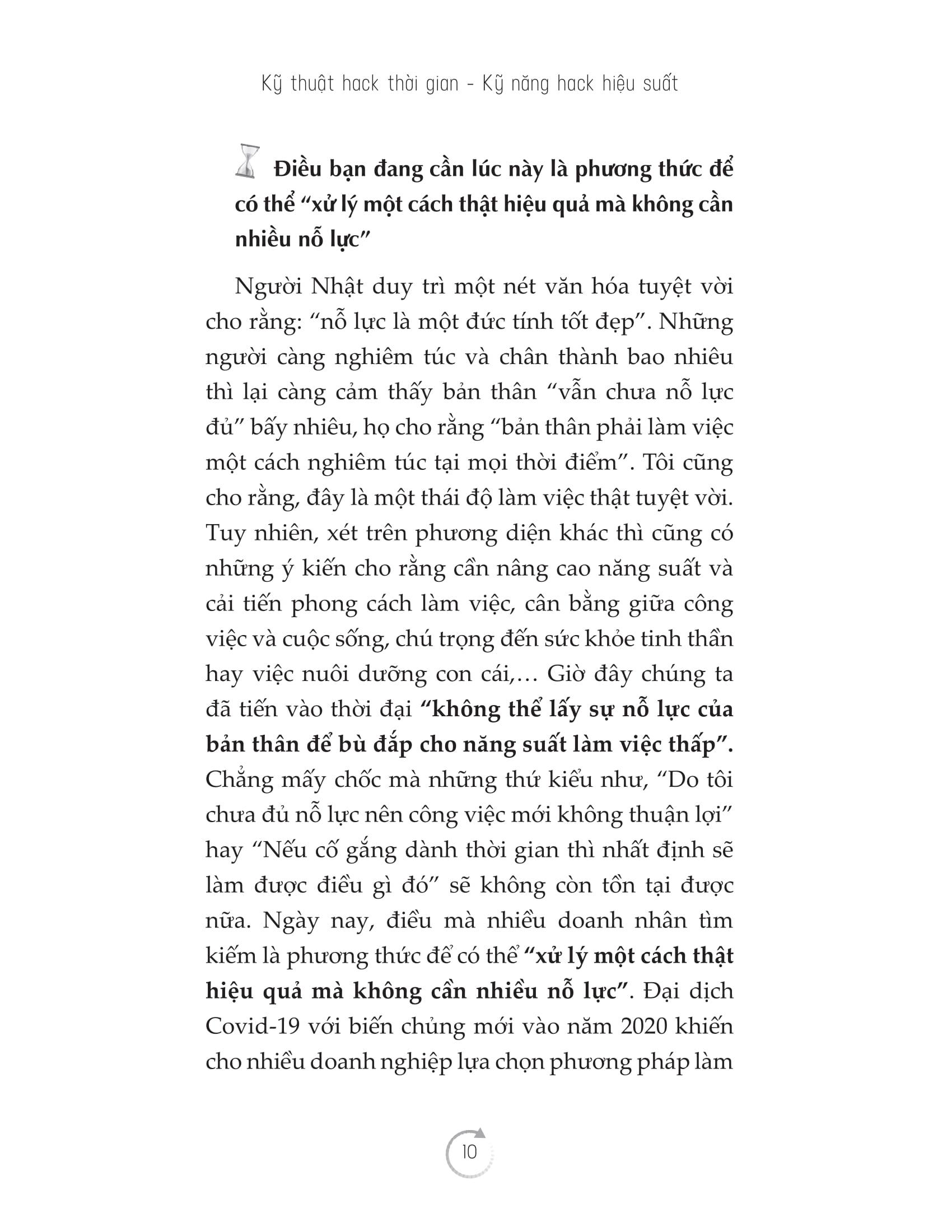 Nếu bạn đang rơi vào những tình huống như trên và cảm thấy mệt mỏi rã rời, điều bạn đang cần lúc này là phương thức để có thể “xử lý một cách thật hiệu quả mà không cần nhiều nỗ lực”. Hãy bắt đầu sắp xếp lại công việc và cuộc sống của bạn với “Kỹ thuật hack thời gian - Kỹ năng hack hiệu suất”, cuốn sách mang đến những phương thức để có thể xử lý công việc một cách hiệu quả mà không cần phải nỗ lực quá nhiều.