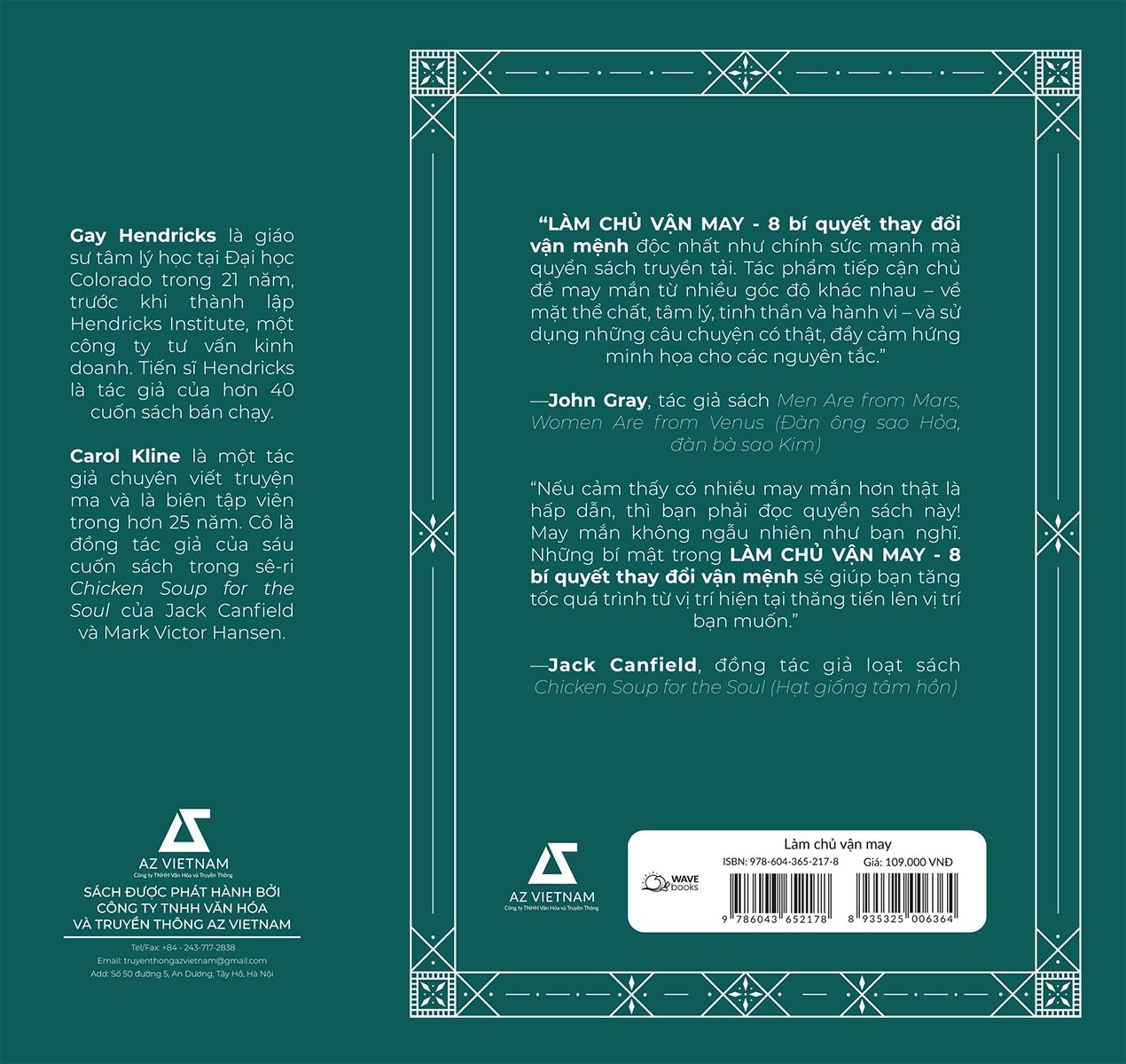 LÀM CHỦ VẬN MAY chứa đựng 8 Bí Quyết cho phép bạn chủ động thay đổi vận may, sẽ giúp bạn đạt được vận may vững chắc từ chính gốc rễ con người bạn. 4 bí quyết đầu tiên cho phép bạn thay đổi cốt lõi con người mình, tạo nền tảng vững chắc nuôi dưỡng vận may. 4 bí quyết tiếp theo là rèn luyện hằng ngày được xây dựng trên nền tảng đó, biến những thay đổi cốt lõi thành những thói quen nâng cao và tạo ra vận may đáng kể cho chính bạn.