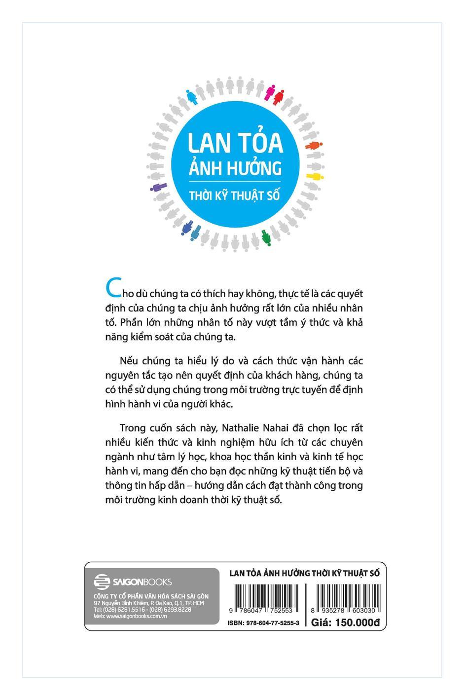 Cho dù chúng ta có thích hay không, thực tế là các quyết định của chúng ta chịu ảnh hưởng rất lớn của nhiều nhân tố. Phần lớn những nhân tố này vượt tầm ý thức và khả năng kiểm soát của chúng ta. Nếu chúng ta hiểu lí do và cách thức vận hành các nguyên tắc tạo nên quyết định của khách hàng, chúng ta có thể sử dụng chúng trong môi trường trực tuyến để định hình hành vi của người khác. Trong Lan tỏa ảnh hưởng thời kỹ thuật số, Nathalie Nahai đã chọn lọc rất nhiều kiến thức và kinh nghiệm hữu ích từ các chuyên ngành như tâm lý học, khoa học thần kinh và kinh tế học hành vi, mang đến cho bạn đọc những kỹ thuật tiến bộ và thông tin hấp dẫn – hướng dẫn cách đạt thành công trong môi trường kinh doanh thời kỹ thuật số.