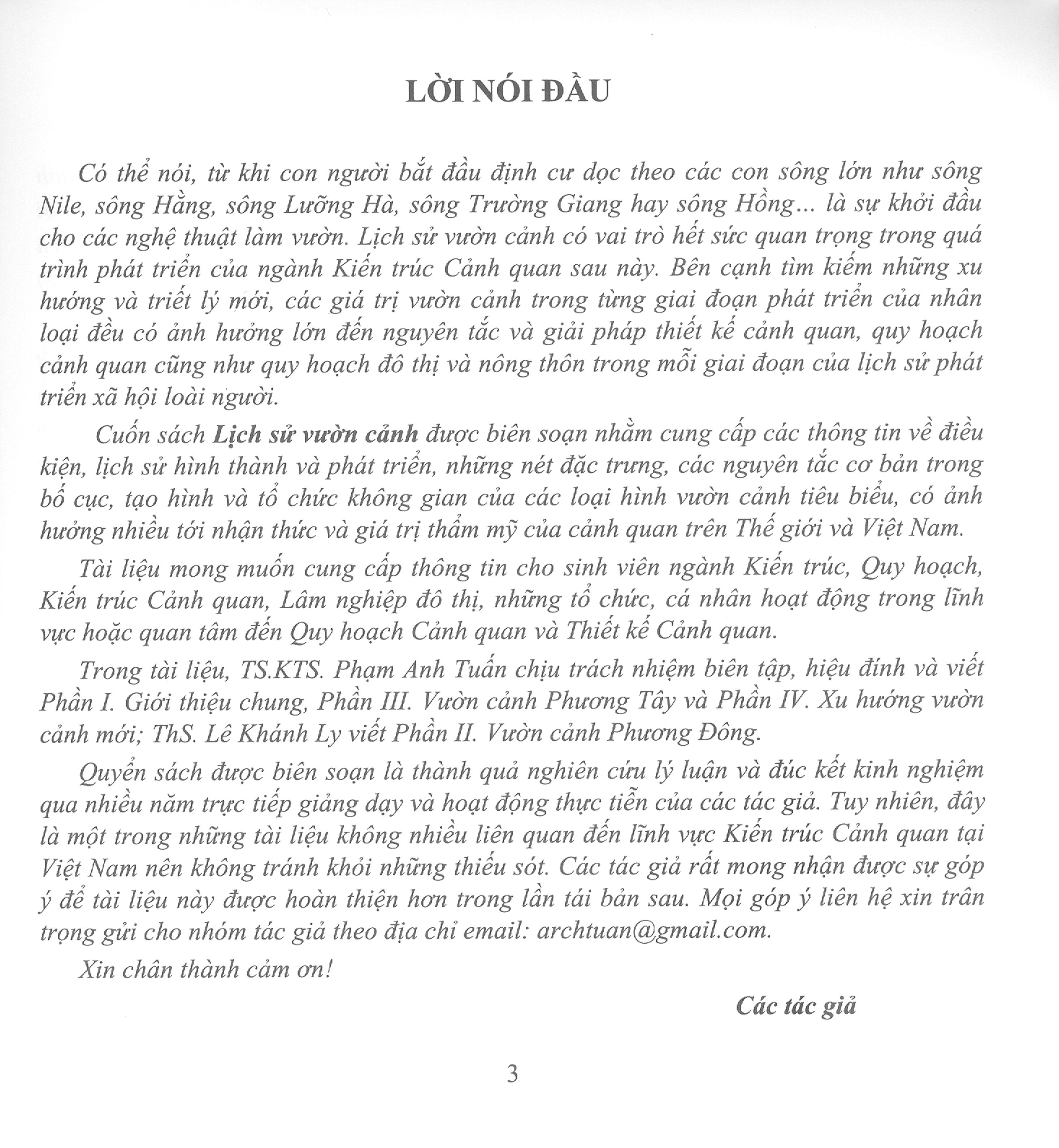 Lịch Sử Vườn Cảnh Có thể nói, từ khi con người bắt đầu định cư dọc theo các con sông lớn như sông Nile, sông Hằng, sông Lưỡng Hà, sông Trường Giang hay sông Hồ là sự khởi đầu cho các nghệ thuật làm vườn. Lịch sử vườn cảnh có vai trò hết sức quan trọng trong quá trình phát trỉển của ngành Kiến trúc Cảnh quan sau này. Bên cạnh tìm kiếm những xu hướng và triết lý mới, cảc giá trị vườn cảnh trong từng giai đoạn phát triền của nhân loại đều có ảnh hưởng lớn đến nguyên tắc và giải pháp thiết kế cảnh quan, quy hoạch cảnh quan cũng như quy hoạch đô thị và nông thôn trong môi giai đoạn của lịch sử phát trỉến xã hội loài người. Cuốn sách “Lịch sử vườn cảnh” được biên soạn nhằm cung cấp các thông tin về điều kiện, lịch sử hình thành và phát trin, những nét đặc trưng, các nguyên tắc cơ bản trong bố cục, tạo hình và tô chức không gian của các loại hình vườn cảnh tiêu biêu, có ảnh hưởng nhiều tới nhận thức và giá trị thẩm mỹ của cảnh quan trên Thế giới và Việt Nam. Tài liệu mong muốn cung cấp thông tin cho sinh viên ngành Kiến trúc, Quy hoạch, Kiến trúc Cảnh quan, Lâm nghiệp đô thị, những tổ chức, cá nhân hoạt động trong lĩnh vực hoặc quan tâm đến Quy hoạch Cảnh quan và Thiết kế Cảnh quan.