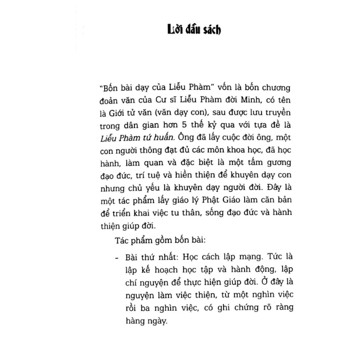 “ Bốn bài dạy của Liễu Phàm” vốn là bốn chương đoản văn của Cư sĩ Liễu Phàm đời Minh, có tên là Giới tử văn (văn dạy con ), sau được lưu truyền trong dân gian hơn 5 thế kỷ qua với tựa đề là Liễu Phàm tứ huấn. Ông đã lấy cuộc đời ông, một con người thông đạt đủ các môn khoa học đã học hành, làm quan và đặt biệt là một tấm gương đạo đức, trí tuệ và hiền thiện để khuyên dạy con nhưng chủ yếu là khuyên dạy người đời. Đây là một tác phẩm lấy giáo lý Phật Giáo làm căn bản để triển khai việc tu thân, sống đạo đức và hành thiện giúp đời.
