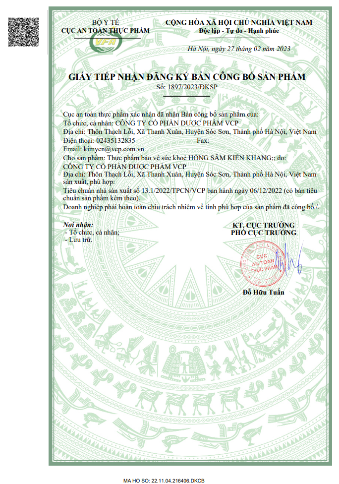 TPBVSK HỒNG SÂM KIỆN KHANG hỗ trợ tăng cường sức khỏe, tăng cường sức đề kháng, giảm mệt mỏi.