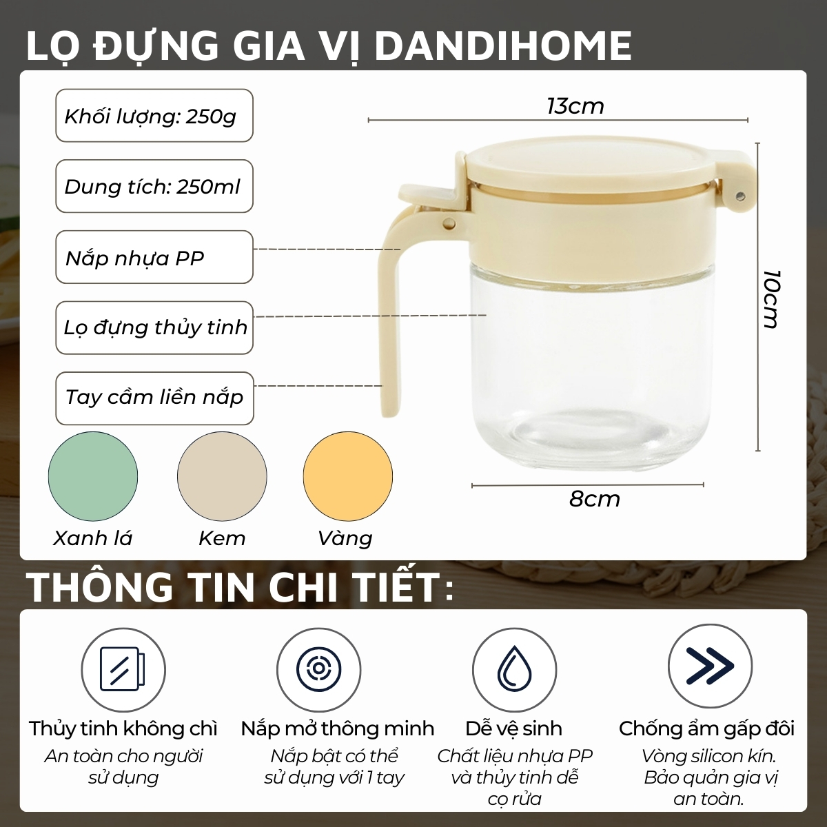Lọ đựng gia vị thông minh DandiHome Thông tin chi tiết: + Kích thước: 13x10cm + Khối lượng: 250g + Dung tích: 250ml + Nắp nhựa PP: Nắp bật có thể sử dụng với 1 tay + Lọ đựng Thủy tinh không chì: An toàn cho người sử dụng + Tay cầm liền nắp + Màu: xanh lá, kem, vàng + Vòng silicon kín. Bảo quản gia vị an toàn. TẶNG muỗng GIA VỊ 3ML nhựa pp: Mỗi lọ đều được DandiHome tặng kèm 1 muỗng nhựa 3ml. Giúp bạn dễ dàng kiểm soát liều lượng gia vị chính xác.