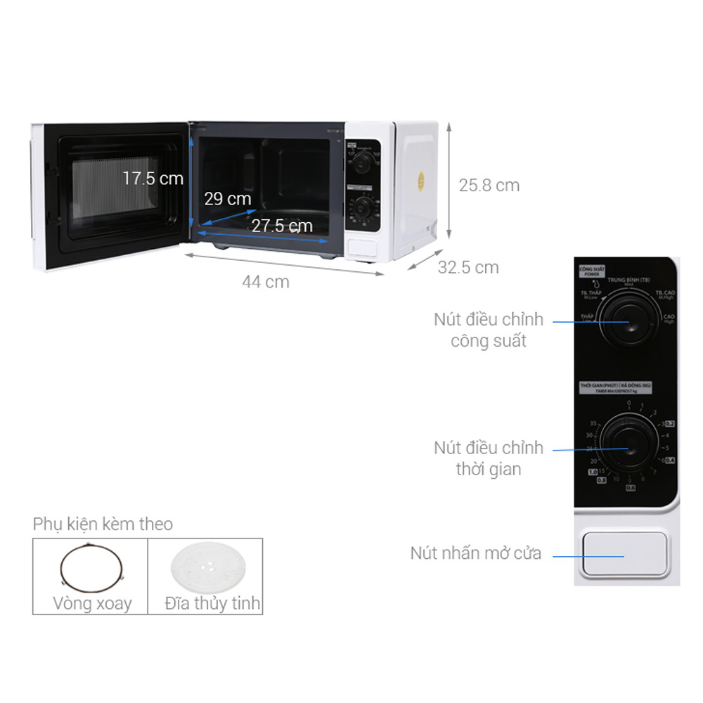 Tính năng nổi bật : – Bảng điều khiển cơ học dễ dàng sử dụng – 6 mức công suất linh hoạt cho ngưởi sử dụng – Tích hợp chức năng nướng tiện dụng – Thiết kế sang trọng hiện đại.   THÔNG SỐ KỸ THUẬT Đường kính đĩa 24,4cm Công Suất Đầu Ra (vi sóng) 700W Công Suất Đầu Vào(vi sóng) 1100W Điện Áp 220v-50hz Dung Tích Lò Vi Sóng 20L Trọng lượng khoảng 10,5 kg Công Suất Nướng 720W Kích thước bề ngoài (cm) 47 x 38 x 28.5