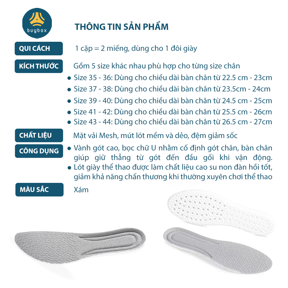 Kích thước: 35-36, 37-38, 39-40, 41-42, 43-44, DÙNG KÉO CẮT THEO VẠCH SIZE IN TẠI MẶT DƯỚI ĐỂ CÓ SIZE CẦN SỬ DỤNG.