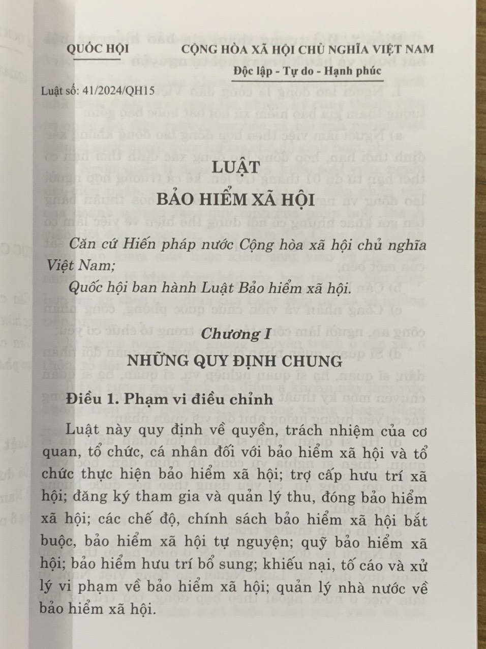 Luật Bảo hiểm xã hội năm 2024 NXB: Chính trị Quốc gia Sự thật Tác giả: Quốc Hội Ngày xuất bản: 7.2024 Khổ sách:13*19cm Công ty phát hành: NXB Chính trị Quốc gia Sự