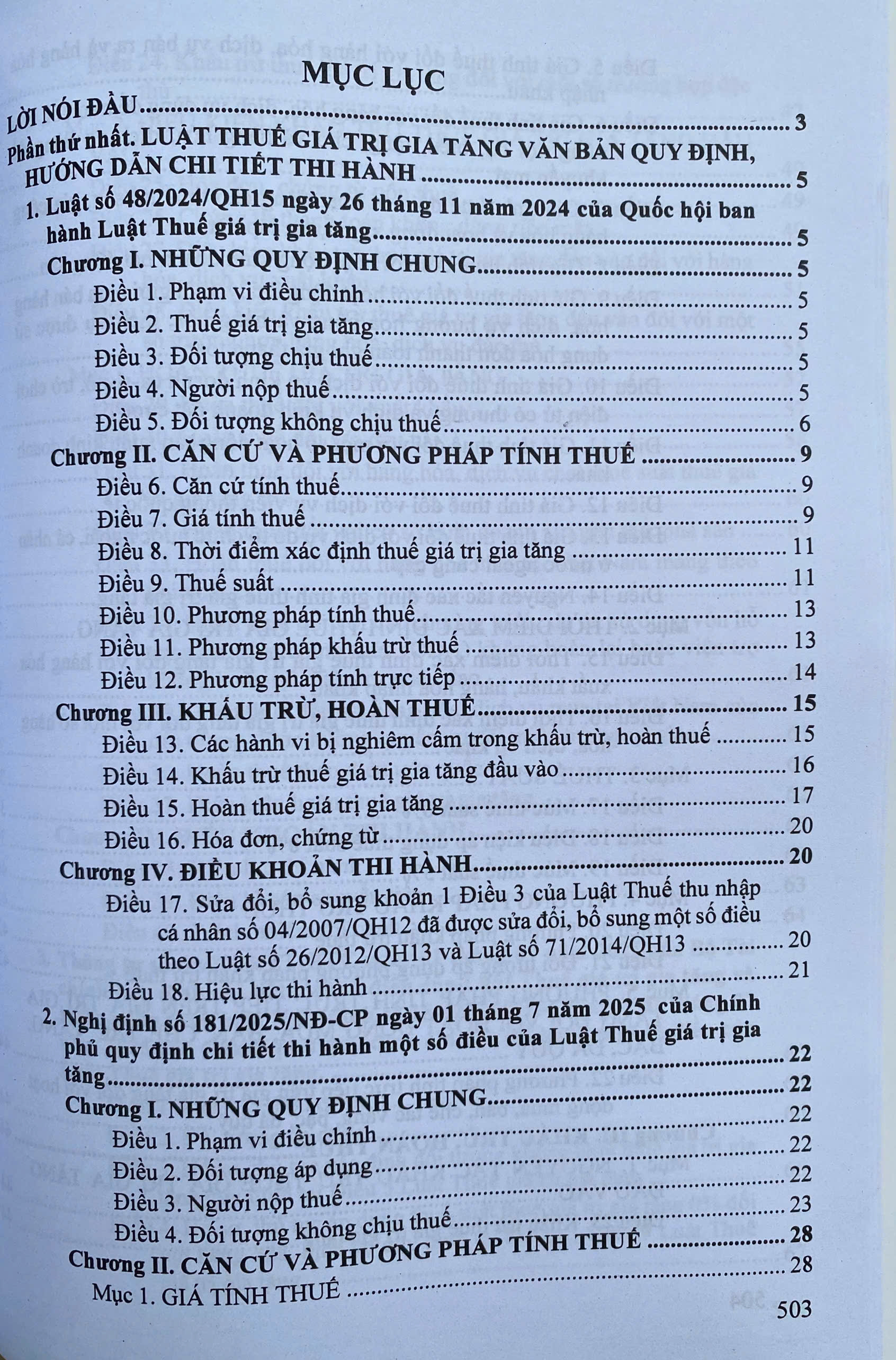 Thời gian qua Quốc hội khóa XV, Quốc hội nước Cộng hòa xã hội chủ nghĩa Việt Nam đã thông qua nhiều Luật quan trọng liên quan đến các luật về thuế trong đó có: Luật số 48/2024/QH15 ngày 26 tháng 11 năm 2024 của Quốc hội ban hành Luật Thuế giá trị gia tăng (sau đây gọi tắt là Luật Thuế giá trị gia tăng 2024); Luật số 67/2025/QH15 ngày 14 tháng 6 năm 2025 của Quốc hội ban hành Luật Thuế thu nhập doanh nghiệp (sau đây gọi tắt là Luật Thuế thu nhập doanh nghiệp 2025); Luật số 66/2025/QH15 ngày 14 tháng 6 năm 2025 của Quốc hội ban hành Luật Thuế tiêu thụ đặc biệt (sau đây gọi tắt là Luật Thuế tiêu thụ đặc biệt 2025); Luật số 90/2025/QH15 ngày 25 tháng 6 năm 2025 của Quốc hội ban hành Luật sửa đổi, bổ sung một số điều liên quan đến Luật Thuế giá trị gia tăng; Luật Thuế xuất khẩu, thuế nhập khẩu… Nhằm cung cấp có hệ thống kiến thức pháp luật về Thuế và các văn bản hướng dẫn đến quý đọc giả Nhà xuất bản Hồng Đức cho xuất bản cuốn sách: LUẬT THUẾ; THUẾ GIÁ TRỊ GIA TĂNG; THU NHẬP DOANH NGHIỆP; THUẾ THU NHẬP CÁ NHÂN; THUẾ XUẤT KHẨU, THUẾ NHẬP KHẨU; THUẾ TIÊU THU ĐẶC BIỆT; THUẾ TÀI NGUYÊN; THUẾ BẢO VỆ MÔI TRƯỜNG; THUẾ SỬ DỤNG ĐẤT PHI NÔNG NGHIỆP VÀ CÁC VĂN BẢN HƯỚNG DẪN THI HÀNH