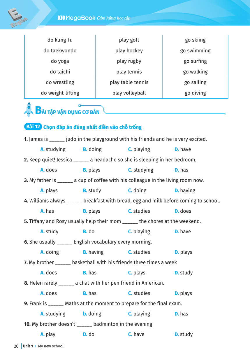 - Bài tập vận dụng đa dạng Bài tập vận dụng được chia thành 2 phần Bài tập vận dụng cơ bản: Các dạng bài tập ôn luyện từ vựng và ngữ pháp ở mức độ cơ bản bám sát chương trình học và kiểm tra mới của bộ giáo dục và đào tạo Bài tập vận dụng nâng cao: Rèn luyện khả năng sử dụng từ vựng và ngữ pháp với bài tập ở mức độ nâng cao giúp đánh giá năng lực và sự tiến bộ qua từng bài học.