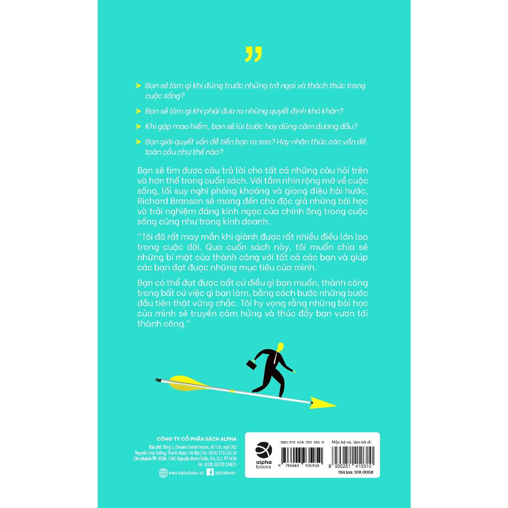 Mặc kệ nó, làm tới đi! là cuốn sách giúp bạn tự tin, sáng tạo và có cái nhìn lạc quan hơn về mọi vấn đề thông qua những câu chuyện và trải nghiệm đầy mới mẻ, thú vị của một trong những tỷ phú hàng đầu nước Anh. Bạn sẽ làm gì khi đứng trước những trở ngại và thách thức trong cuộc sống? Bạn sẽ làm gì khi phải đưa ra những quyết định khó khăn? Bạn giải quyết vấn đề tiền bạc ra sao? Hay nhận thức các vấn để toàn cầu như thế nào? Câu trả lời sẽ được tìm thấy trong cuốn sách đầy thú vị Mặc kệ nó, làm tới đi! của Richard Branson – Chủ tịch của Virgin, đứng thứ 5 trong danh sách các doanh nhân giàu nhất nước Anh và xếp thứ 254 trong danh sách tỷ phú của tạp chí Forbes năm 2011 – đồng thời cũng là tác giả cuốn tự truyện nổi tiếng Đường ra biển lớn đã được Alpha Books xuất bản năm 2012. Cuốn sách đã được dịch sang 15 thứ tiếng khác nhau và là một trong những cuốn sách bán chạy trên toàn thế giới, được xếp hạng là đầu sách bestseller tại Nam Phi và Australia. Cuốn sách cho người đọc thấy được cách Richard Branson đạt được tất cả những thành tích phi thường đó trong hoàn cảnh là một người mắc bệnh khó đọc từ nhỏ và buộc phải thôi học năm 16 tuổi do khả năng học tập rất hạn chế. Trong Mặc kệ nó, làm tới đi! bạn sẽ nhận thấy một cái nhìn mới mẻ về cuộc sống cũng như kinh doanh thông qua những trải nghiệm, những bài học ông học được từ lúc còn nhỏ, từ khi khởi nghiệp vào năm 16 tuổi, cho đến nay khi đã trở thành 1 trong 4 doanh nhân được đánh giá là vĩ đại nhất hiện nay trên thế giới. Xét từ hóc độ sáng tạo, cảm giác bay bổng thì những chuyến phiêu lưu mạo hiểm của tác giả được kể lại trong cuốn sách không hề thua kém gì so với các cuốn tiểu thuyết phiêu lưu. Xét về góc độ nhân văn, cuốn sách này sẽ cho bạn đọc những bài học, những câu chuyện ý nghĩa giúp bạn tự tin hơn, tư duy tích cực và sống vui vẻ. Những điều giá trị mà bạn có thể tìm thấy trong cuốn sách: Cứ làm đi: Có mục tiêu, Luôn tin tưởng vào bản thân, Không ngừng cố gắng Hãy vui vẻ: Làm việc chăm chỉ, Nắm bắt các cơ hội, Suy nghĩ tích cực Hãy táo bạo: Tính toán rủi ro, Theo đuổi những mục tiêu và mơ ước, Không hối tiếc Thách thức bản thân: Luôn vươn tới những mục tiêu cao hơn, Cố gắng thử sức những điều mới mẻ Đứng trên đôi chân của chính mình: Dựa vào bản thân, Mơ ước thực tế Sống trong hiện tại: Yêu cuộc sống và sống hết mình, Tận hưởng hiện tại Trân trọng gia đình, bạn bè: Đặt gia đình và bạn bè lên hàng đầu, Lựa chọn đúng người và trọng thưởng nhân tài Tôn trọng mọi người: Lịch sự và tôn trọng người khác, Làm những việc đúng đắn, Giữ gìn tên tuổi, Công bằng trong mọi mối quan hệ Hãy đổi mới: Suy nghĩ sáng tạo, Phá vỡ các quy tắc thông thường Suy nghĩ trẻ trung: Thách thức những điều lớn lao, Bình tĩnh trước mọi thử thách, Luôn có một người bình thường. Mặc kệ nó, làm tới đi! là một cuốn sách đơn giản, dễ đọc với những bài học gần gũi từ cuộc sống, những triết lý vừa sâu sắc mà lại lý thú được truyền đạt thông qua cách nhìn rộng mở, lối suy nghĩ phóng khoáng, kết hợp giọng điệu hài hước mà không hề hời hợt của tác giả.