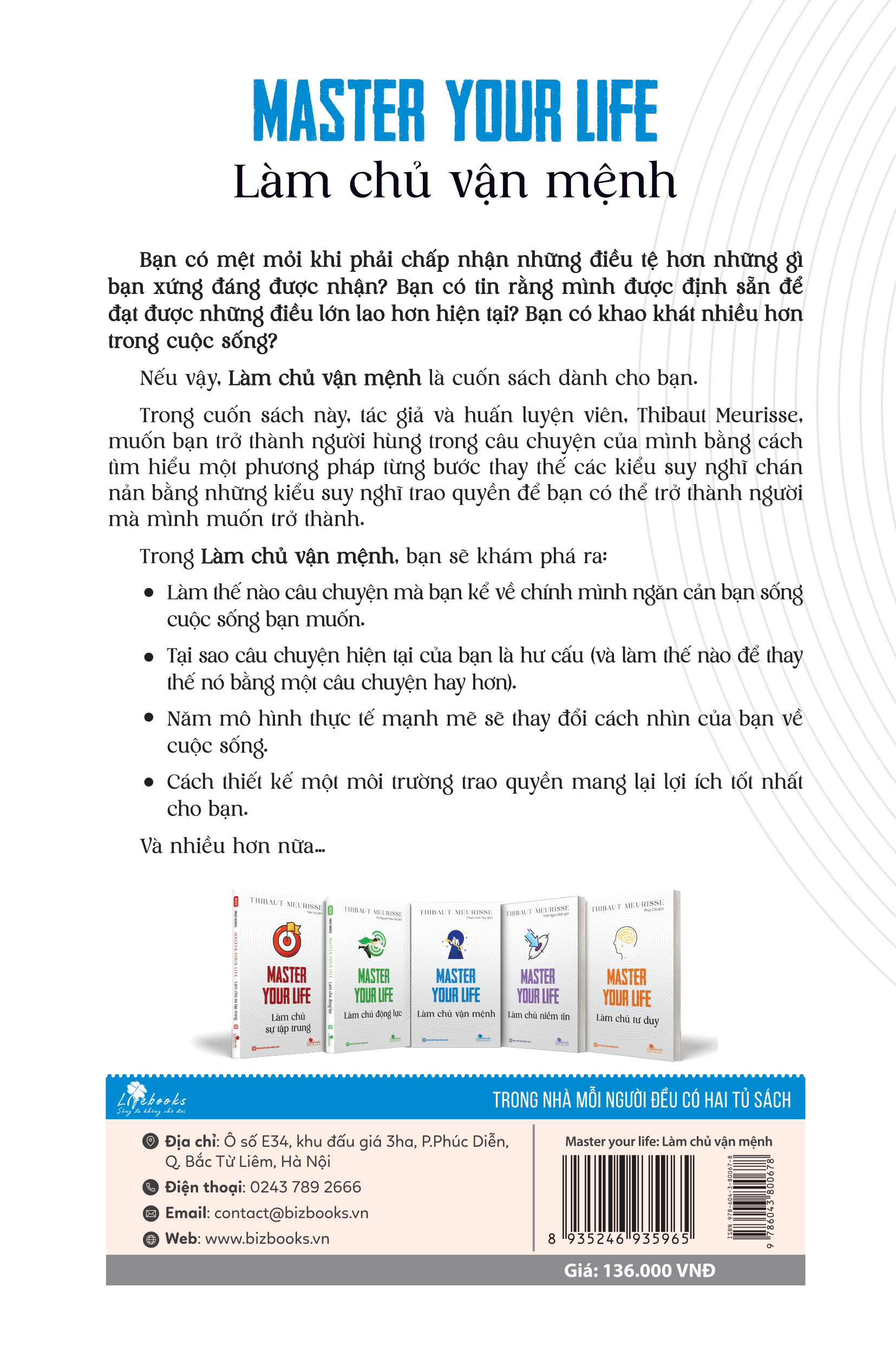 Rất nhiều nhân tố ảnh hưởng tới cuộc đời chúng ta, ví dụ như sự kì vọng của cha mẹ, của thầy cô, thái độ ghét người thân yêu kẻ địệc sử dụng tiền tài như thế nào cũng ảnh hưởng rất lớn tới sự phát triển tiền đồ, một câu nói, một suy nghĩ cũng khiến cuộc đời có những đổi thay khác biệt. Có gì trong cuốn sách Master your life - Làm chủ vận mệnh Cuốn sách do công ty sách Bizbooks xuất bản và phát hành sẽ giúp bạn khám phá được chính xác câu chuyện hiện tại của mình là gì và nó gây cản trở đến việc bạn muốn được sống cuộc đời như mình mong muốn như thế nào. Quan trọng hơn, bạn sẽ tìm hiểu cách thay thế nó bằng một câu chuyện tiếp thêm sức mạnh, hỗ trợ bạn tạo ra tương lai lý tưởng mà bạn hướng tới với tổng nội dung gồm 3 phần: