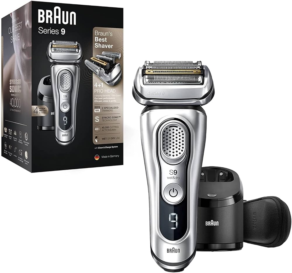 Dao cạo cao cấp của Braun: 4 + 1 đầu cạo. Có hiệu quả. Triệt để. Thoải mái cho da. Sản xuất tại Đức 9385cc + Series 9 – hiện có hiệu suất pin cao